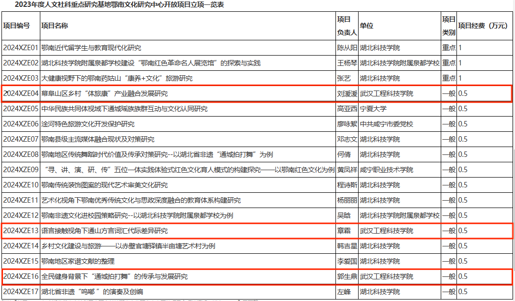 其中,人文学院体育系荣获2项,分别为郭生鼎老师负责的《全民健身背景下“通城拍打舞”的传承与发展研究》;刘湲湲老师负责的《幕阜山区乡村“体旅康”产业融合发展研究》。同时,中文系章霜老师负责的《语言接触视角下通山方言词汇代际差异研究》也在此名单之中。