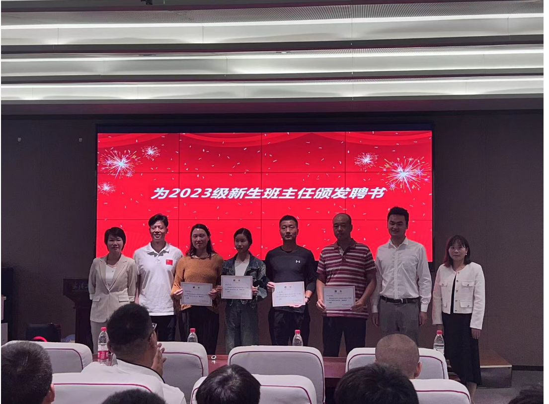 学院领导湛正祥、吴海燕、郭生鼎、宋英老师为2023级社会体育指导员与管理专业新生班级班主任柳晨、万丽芳、张学芬、刘旭东四位老师颁发聘书。