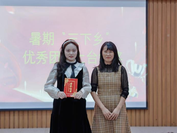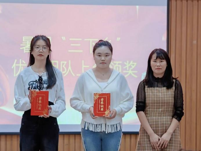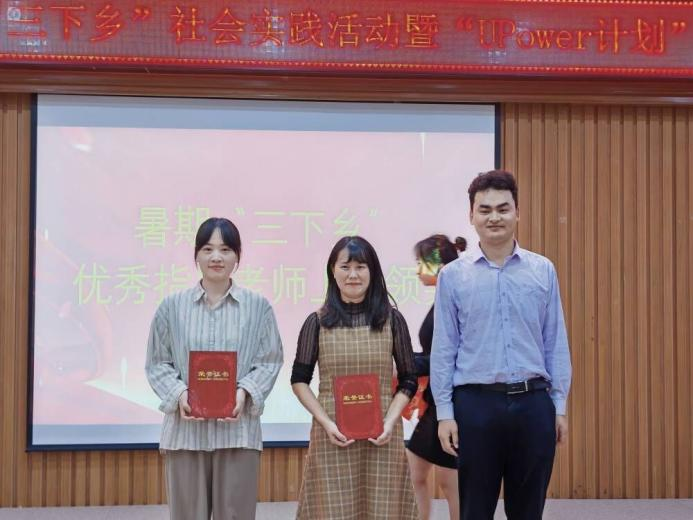湛正祥为“三下乡”优秀指导老师:彭祎、李丽红颁奖。