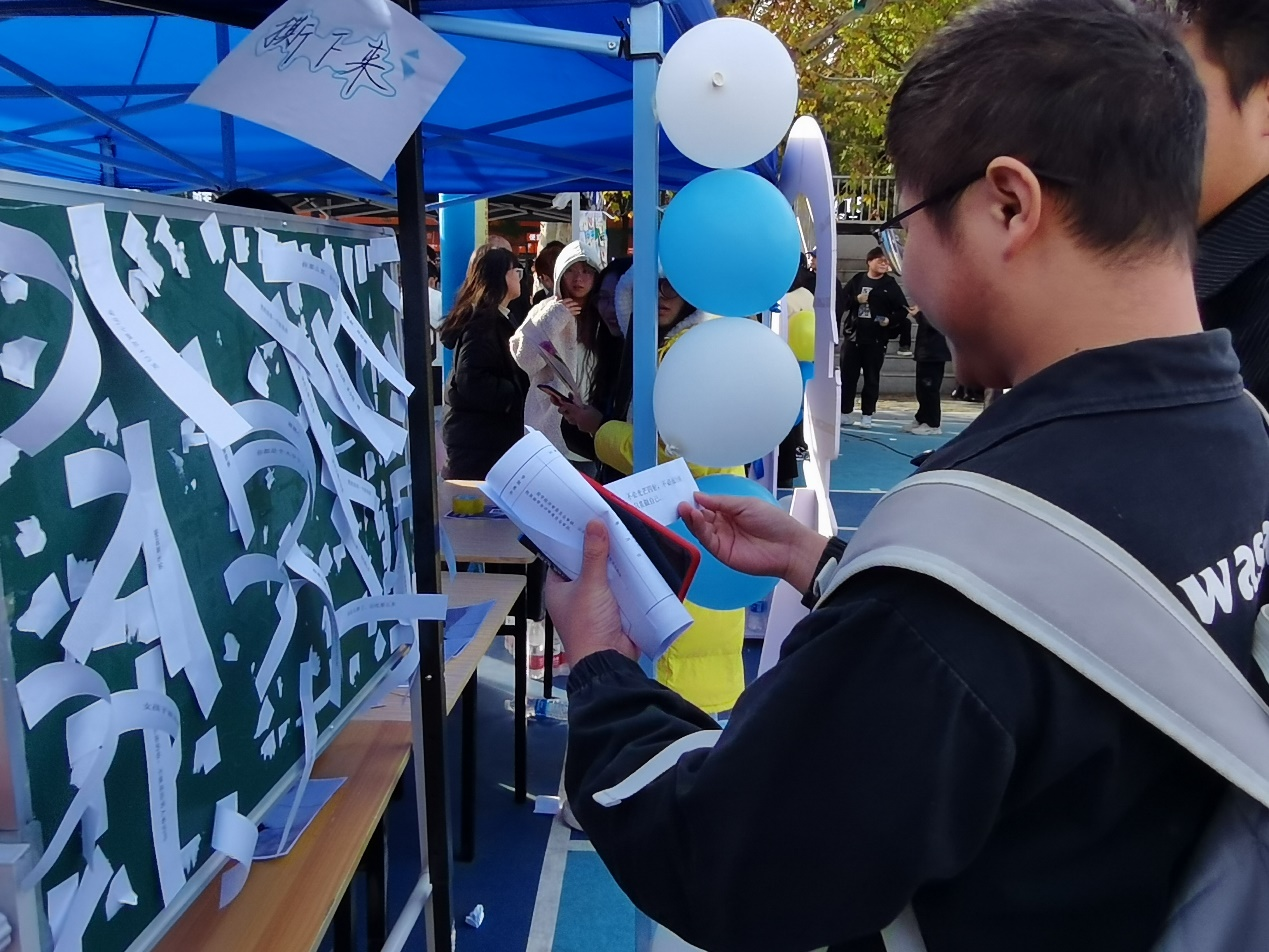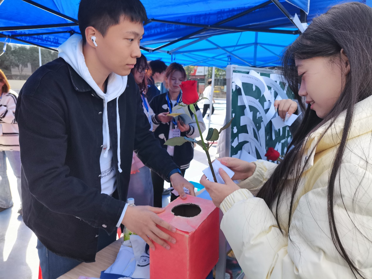此外,人文学院还进行“揭字条 送玫瑰”活动。在一声声喝彩中,人文学子揭下困扰自己的负面情绪标签,即可获得鲜艳的玫瑰。负面标签会影响学生的心理健康,而同学们揭下它、丢掉它,就意味着对过去负面心理的放弃,建立健全健康心理,从而迎接新的未来。此活动能帮助同学们在困难与挫折中保持阳光乐观的心态,勇敢向美好的未来迈进,为塑造积极健康心理品质保驾护航,引导其进行了解自我、善待自我、关爱自我、拥抱自我,主动去发现身边的美好、善待周围的事物。