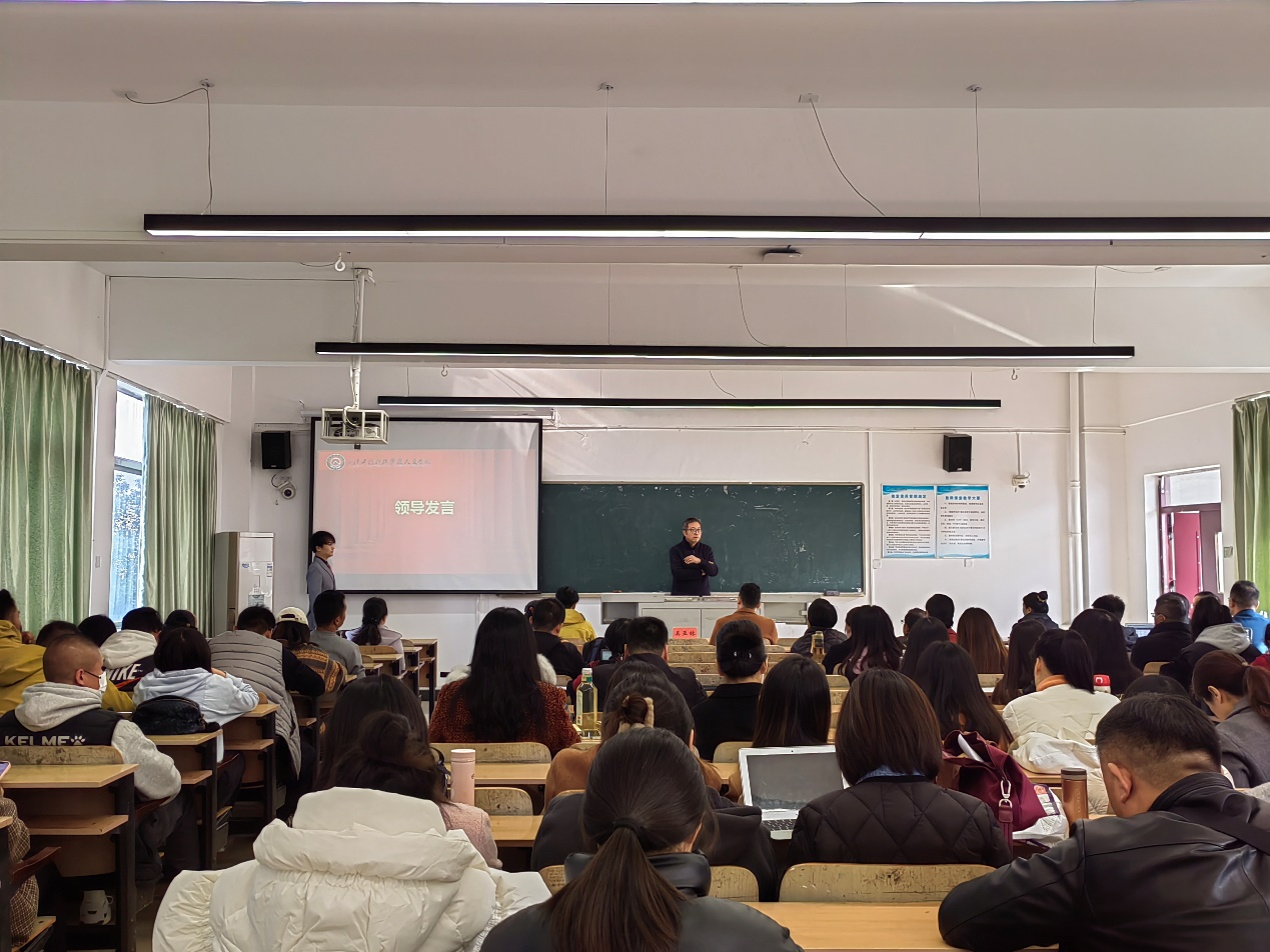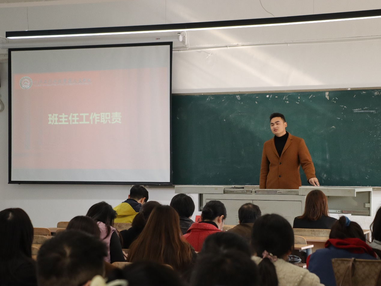随后,人文学院党总支书记湛正祥宣读班主任工作职责。他就班主任教育工作方面提出四点建议:一、要加强学生的思想政治教育,班主任在工作中要积极向上、传播正能量、弘扬好的精神;二、要注意在工作中学生的正常管理,使老师和学生密切联系,班主任深入班级,为同学们提供正确的学习方法;三、要开展心理健康教育,在同学们出现心理问题时及时疏导和介入,化解危机、处理问题;四、要强化学风建设和三观引领,在教学中给予同学们帮助,在职业生涯规划方面给予指导建议。