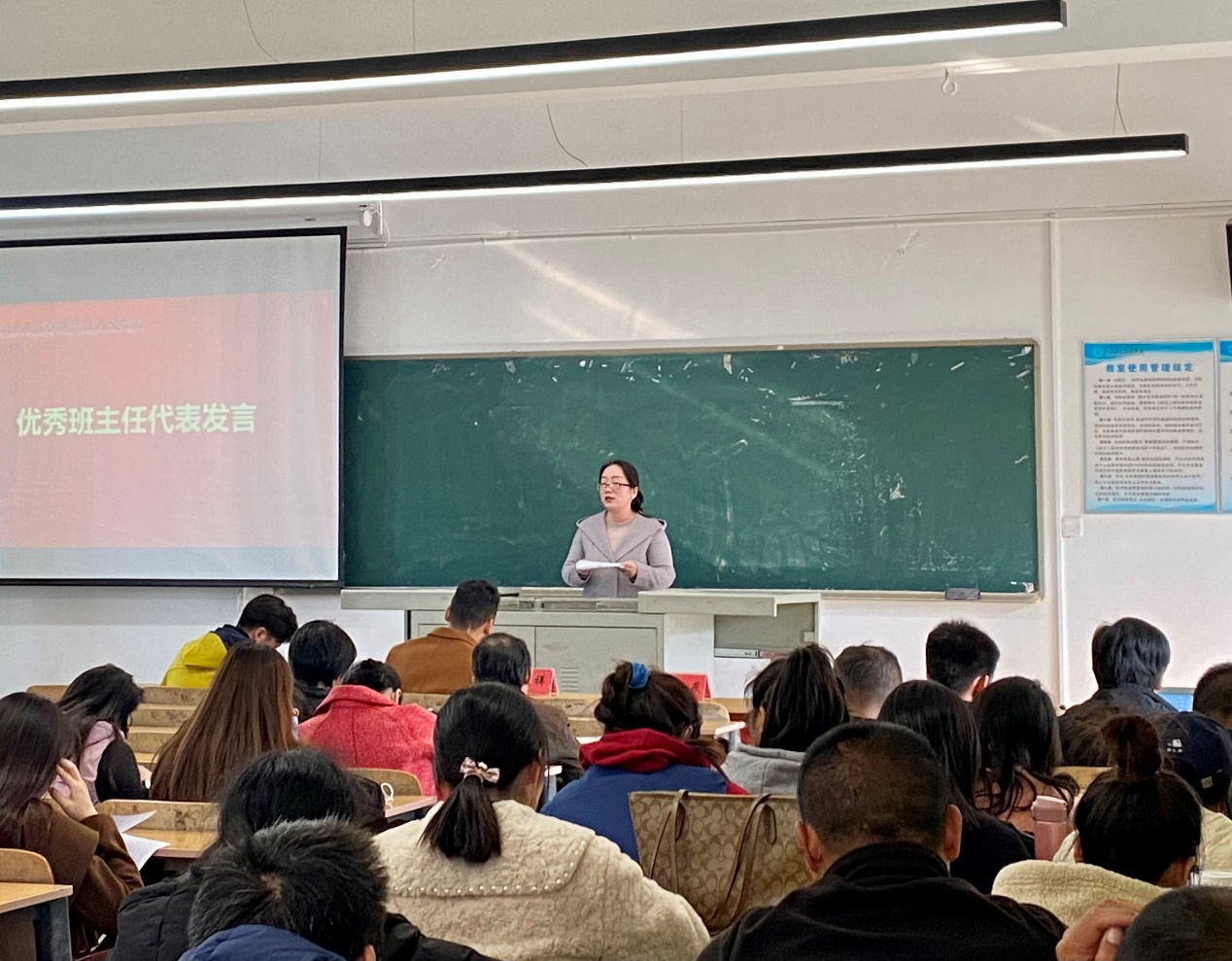 会议最后,人文学院优秀班主任代表易祁进行发言,她对人文学院教育管理制度的不断完善、教师队伍的不断扩大表示感动。同时,她也分享了自己作为班主任的工作经验,她指出班主任要保持和辅导员的联系,以经常沟通来促进工作的及时开展,要充分利用网络聊天平台关注最新消息,给同学们分享学习资料和学习信息。不仅如此,她还强调,班主任应在学习上为同学提供帮助,鼓励支持学生参加各种比赛,掌握班级同学的信息状况后关注有心理问题的学生,呵护其成长。
