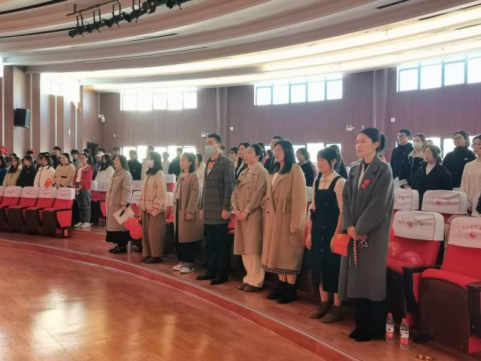 首先,全体起立奏唱国歌,全场气氛严肃,广大师生齐声高唱。
