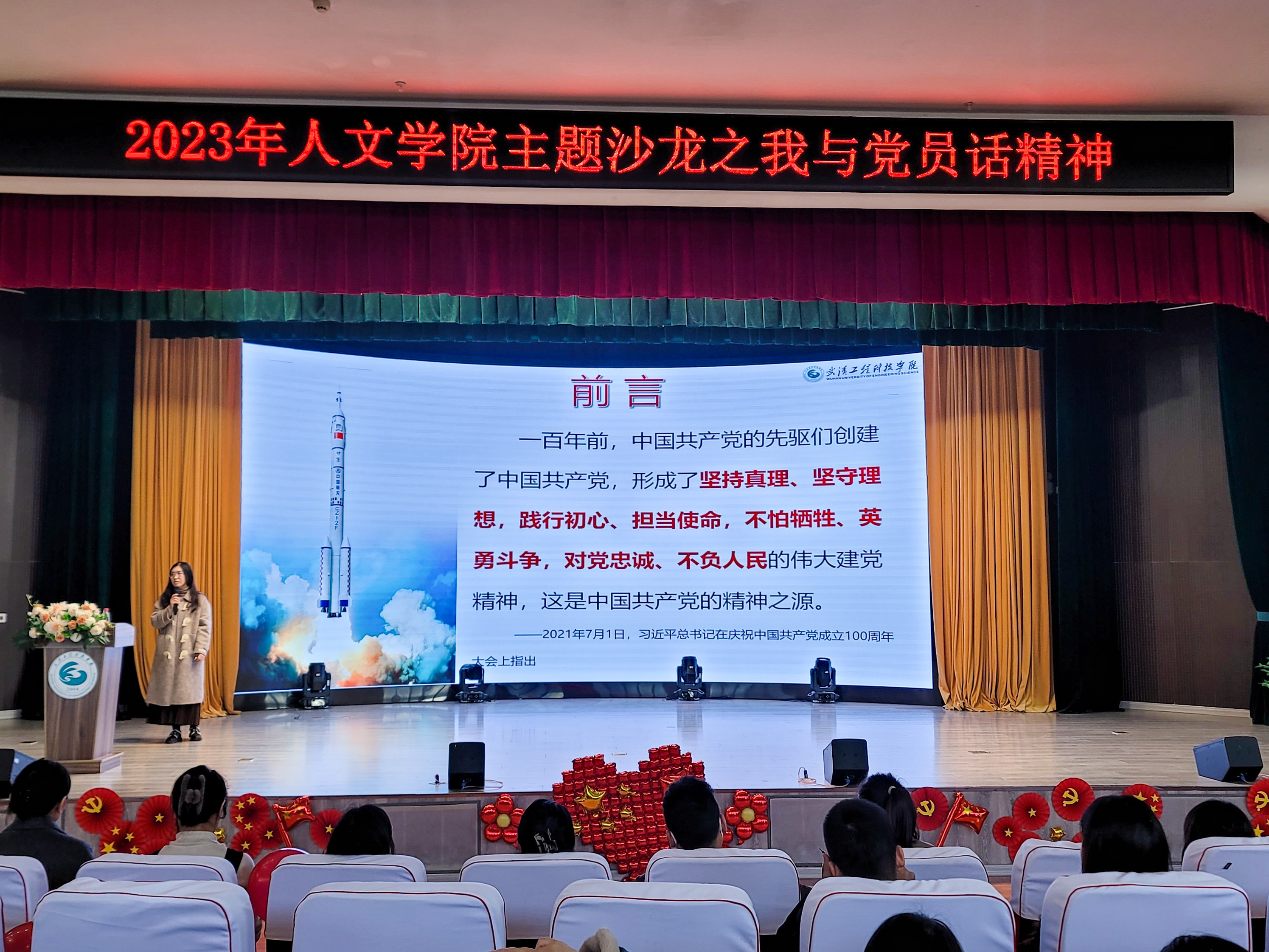 本网讯(通讯员 钱馨琪 尹翰祥 祝林晞 刘博文)为深入学习中国载人航天事业发展历程,了解党员的责任和使命,进一步发挥先进党员及党组织的模范带头作用,12月7日下午两点,我校人文学院于图书馆5区报告厅举办“我与党员话精神”沙龙活动。本次活动特邀马克思主义学院王艳老师作为嘉宾,人文学院党总支书记湛正祥出席,以及广大师生踊跃参与。活动由2021级小学教育的张茗主持。