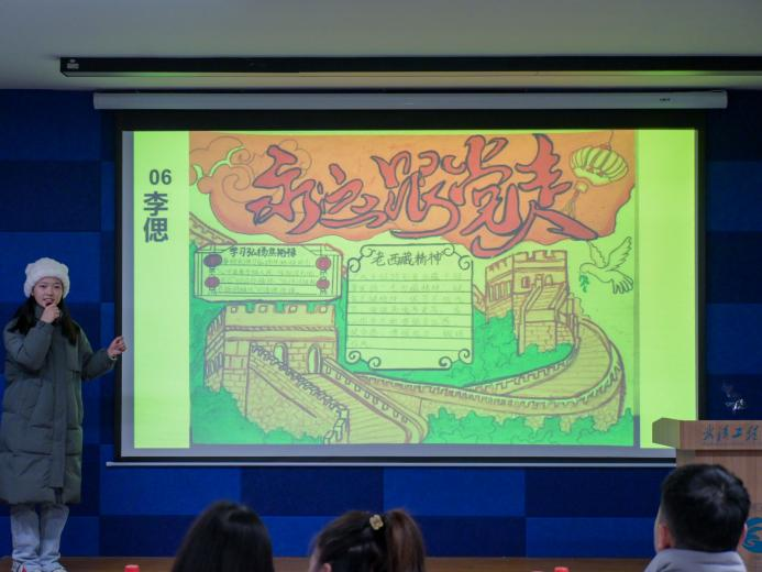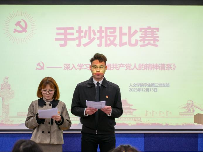 本网讯(通讯员 邱育霖 隆珺羽)为深入学习贯彻党的二十大精神,传承红色精神,赓续红色血脉,引导广大青年学子听党话、感党恩、跟党走,武汉工程科技学院人文学院学生第三党支部开展深入学习《中国共产党人的精神谱系》手抄报比赛,12月13日下午在一号教学楼215教室展开决赛。人文学院团总支书记郭孟言、人文学院学生第三党支部支部书记成风、宣传委员王雪阳、组织委员王峥出席活动,人文学院辅导员和学生代表参加活动。