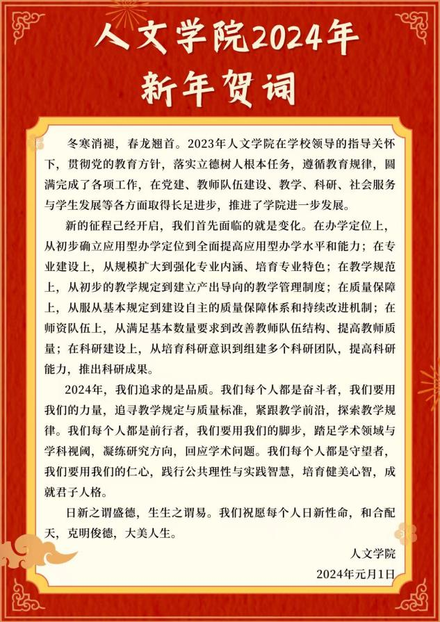 一览贺词,有对过往一年的总结,有立德树人的温度、办学育人的厚度,更有对明日人文学院的希冀。