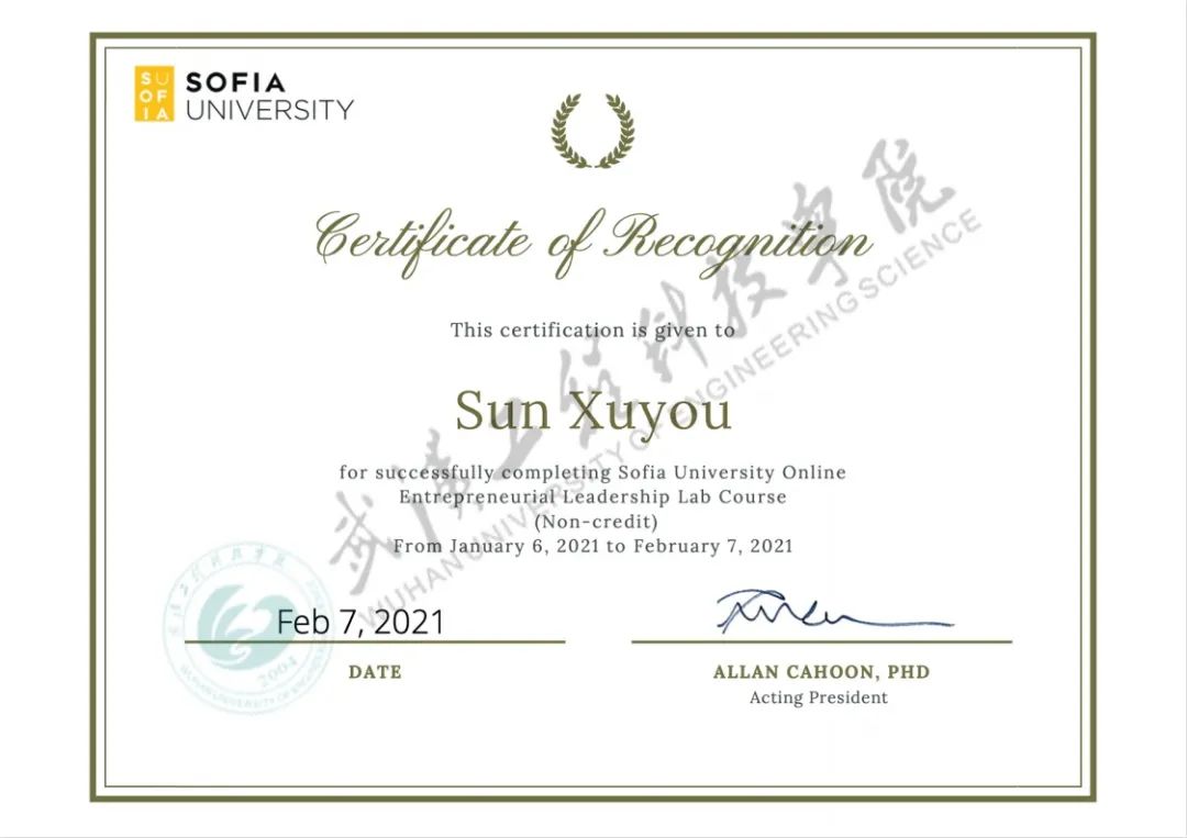 每位学生的领英页面将会自动显示索菲亚大学的电子徽章认证,即自动加入索菲亚大学的全球校友圈,表现优异的同学会获得索菲亚大学颁发的奖状及金徽章。徽章特附索菲亚官方认证,证明学生在项目期间所学习到的领导力、商业分析、跨文化沟通能力等技能。