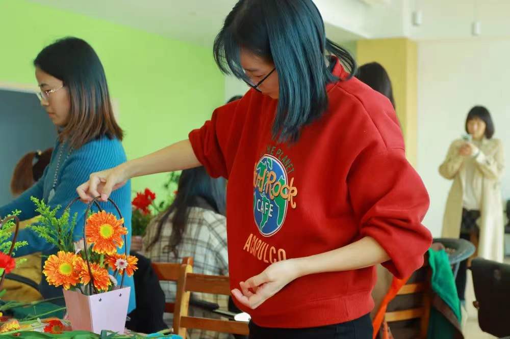 艺术与传媒学院辅导感言员赵磊:诗人王国维说过:“一切物语皆情语”。花更是如此,不同的花都有自己不同的花语,康乃馨的花语是——爱,魅力,尊敬之情;太阳花的花语是——坚韧勇敢、阳光灿烂;黄莺的花语是——象征着美好的开始……在这次心理解压活动的插花过程中,各式各样的花丰富了我的心灵感受,充实了精神世界。让我内心有了无比强大的力量,能与负面情绪共处,可以接纳一时的不如意,甚至喜欢不完美的生活,甚至可以把这些不如意当成是一种动力。
