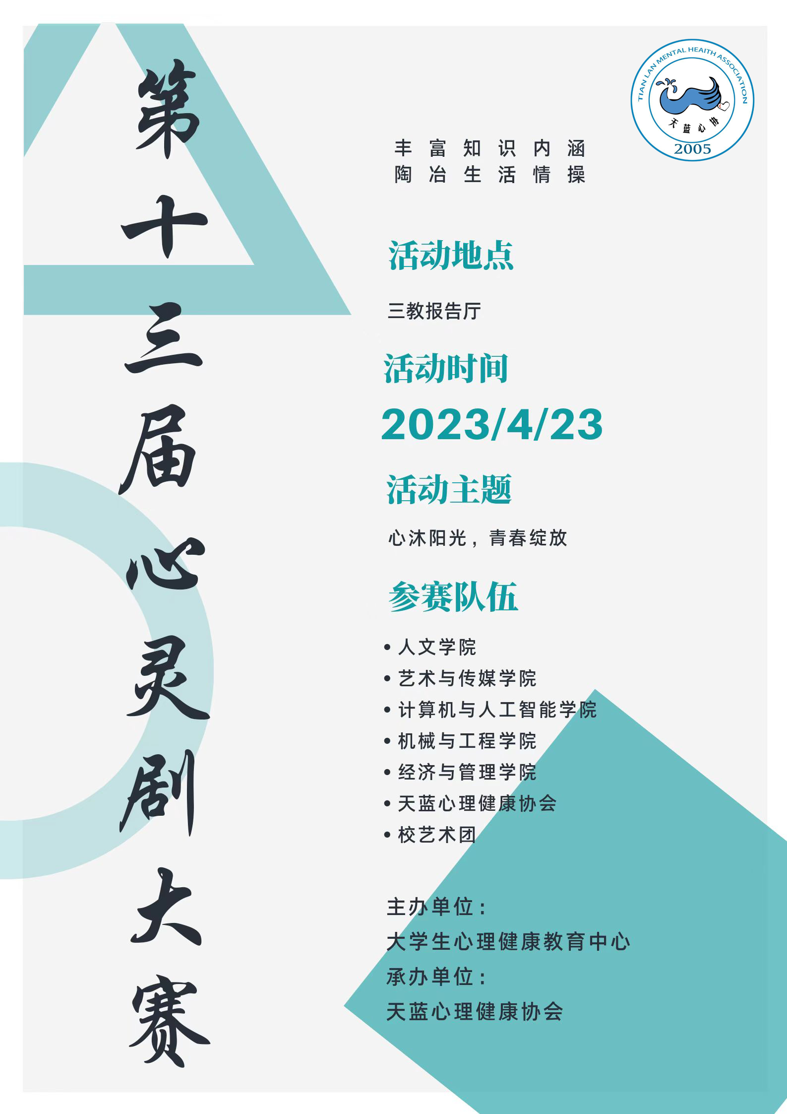 为了丰富大学生的知识内涵、学习氛围、生活情操。第十三届校园心灵情景剧大赛开始倒计时啦~