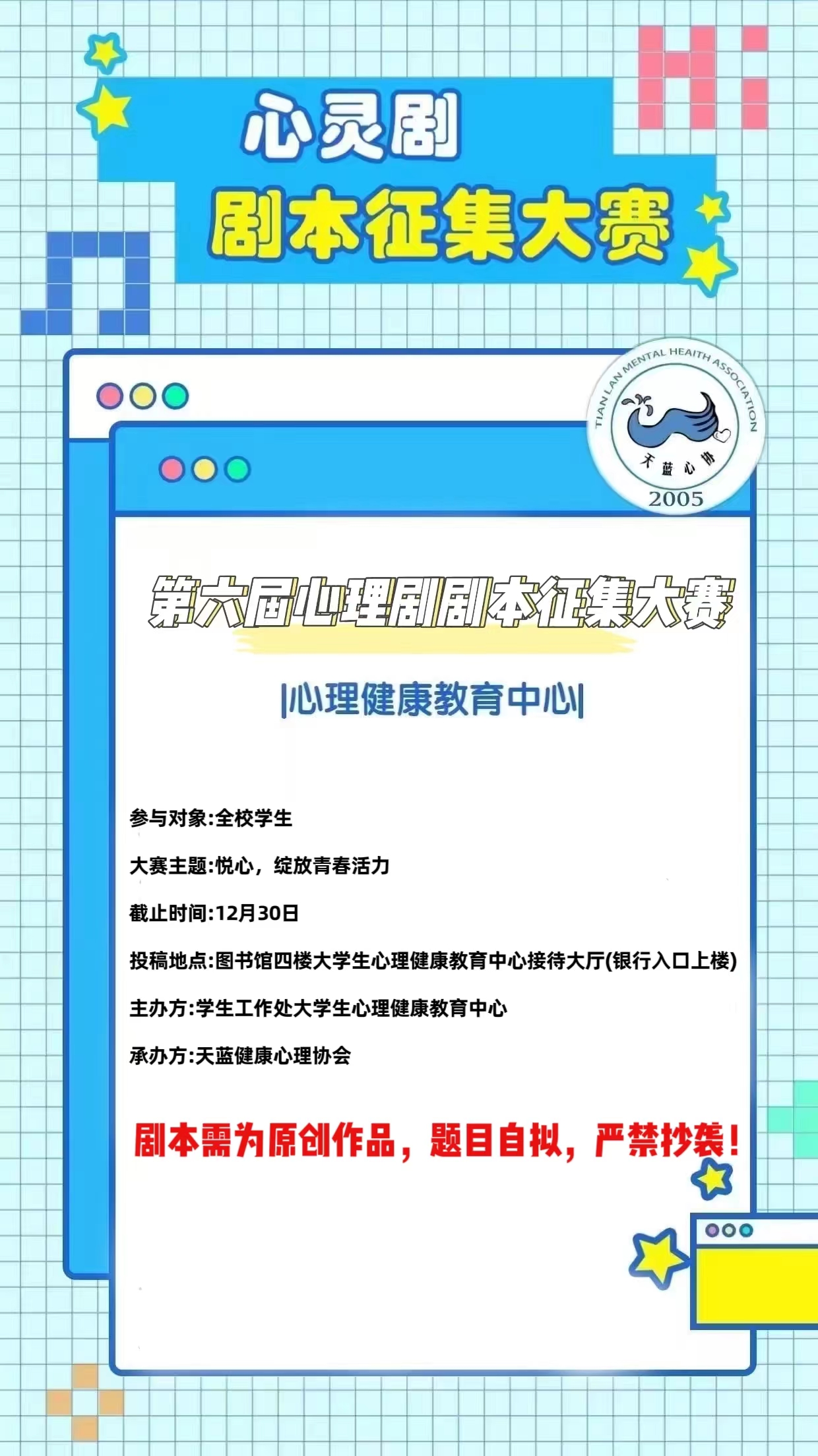 线下投稿方式:将剧本打印纸质档交至图书馆四楼学生工作处大学生心理健康教育中心