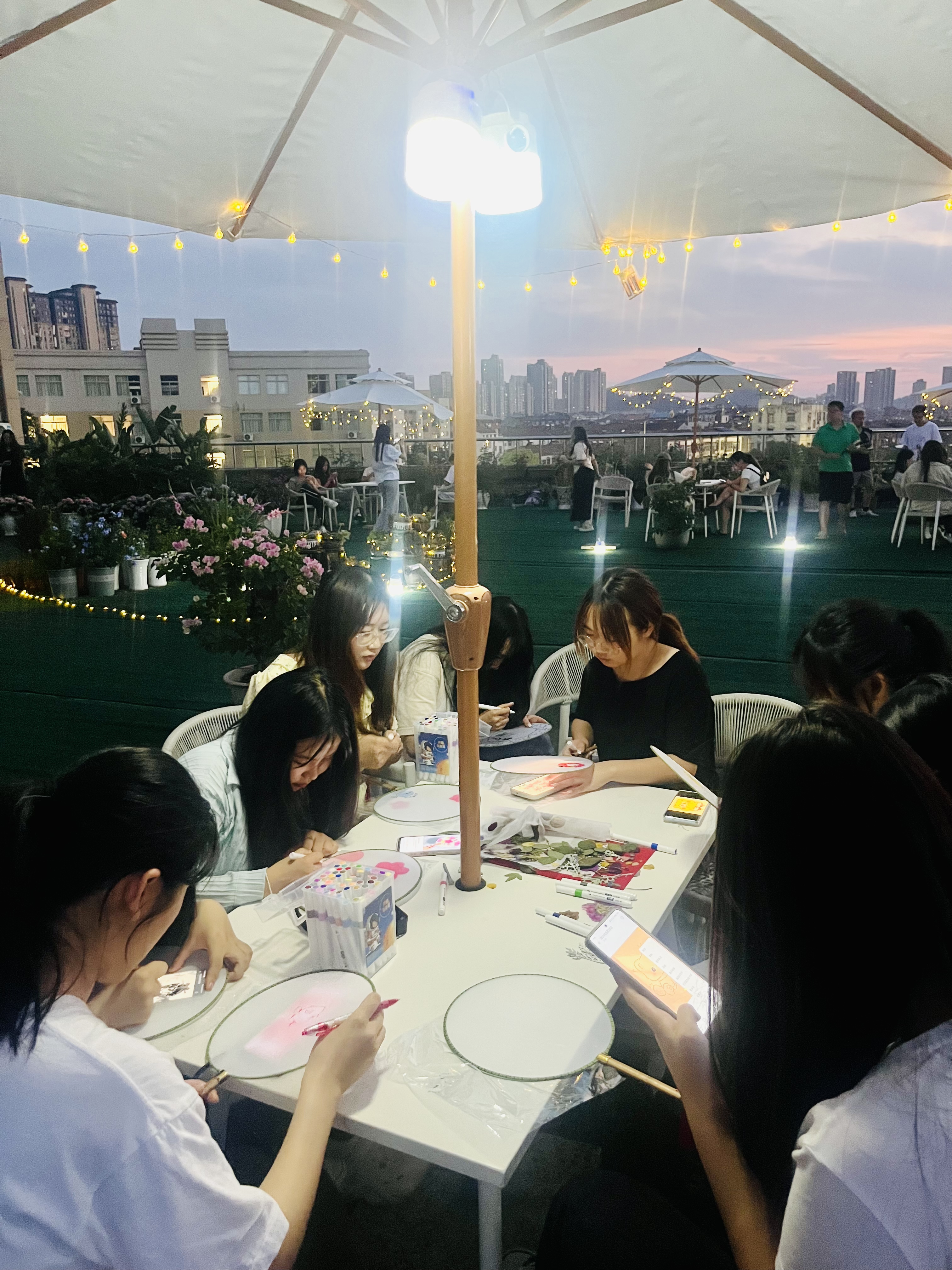 活动现场,随着美丽的日落拉开了序幕,同学们一起欣赏这独特的美景用相机记录着永恒的瞬间,随之而来的是曼妙的音乐,为接下来的游戏增加了不少的趣味氛围,大家互相谈论着游戏着,最引人注目的是团扇作画活动、扎染体验和纸牌真心话大冒险活动。在团扇活动中,大家积极认真的绘画着自己的作品,发挥自己的创造性与想象,为纯洁的团扇增加美丽的图案。在晚风中,太阳的光芒逐渐暗淡,但学生们的热情与青春在这个夜晚被点燃,预示着一个充满活力和创造力的青春的开始。开放夜虽然结束,但它所带来的影响和启示将会在每位参与者心中久久回响,成为他们大学生活中难忘的一部分。同时,感谢所有参与者的热情参与,为活动增添了无限生机。