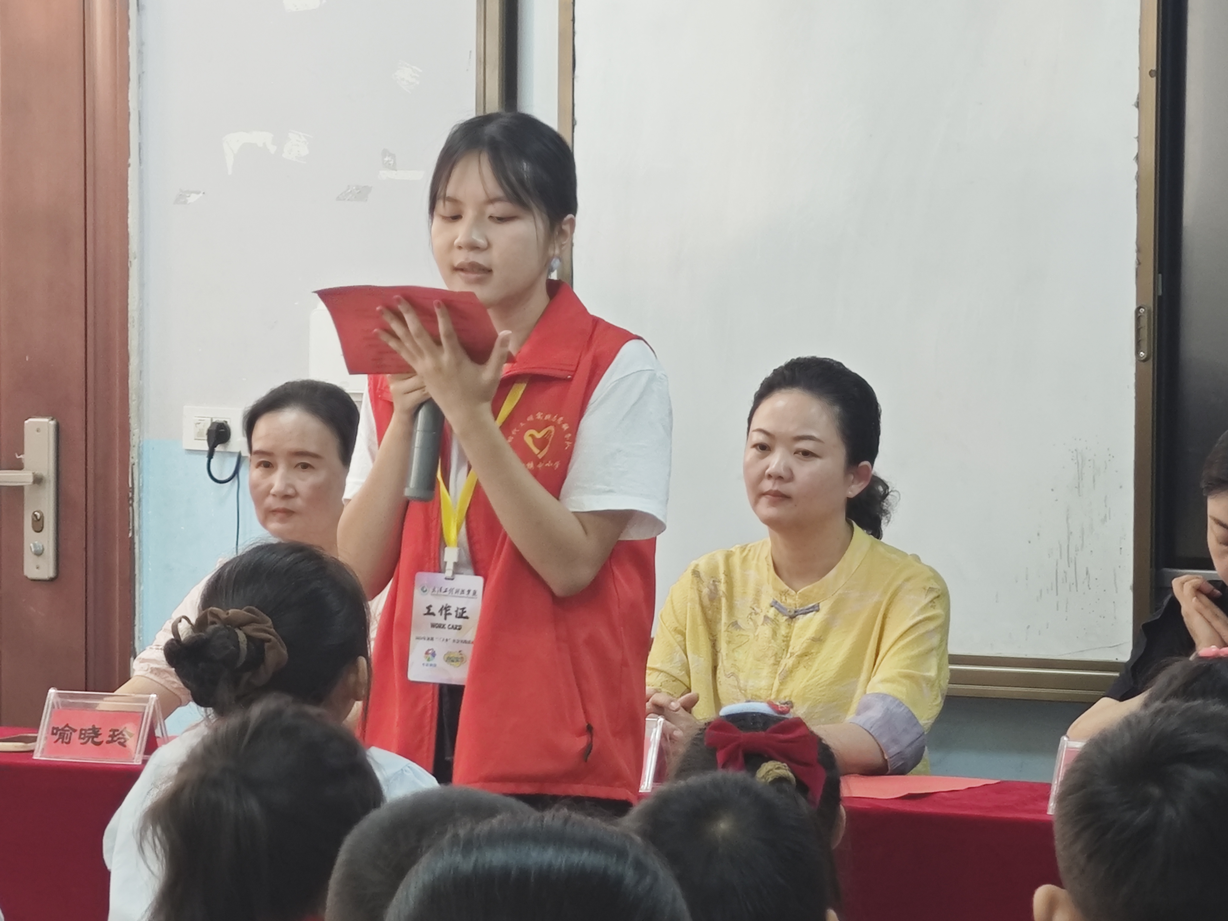 随县厉山镇中心小学学生代表钦紫彤和“南来北往志愿服务团队”副队长庞莉姗依次进行发言,分享在本次暑期三下乡活动过程中的感受和收获。