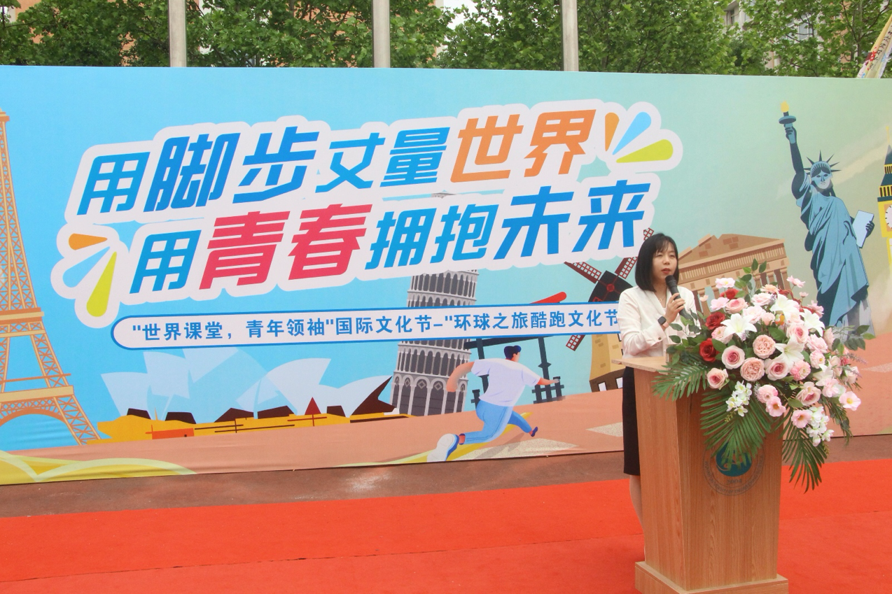 校长助理赵欢致辞,她表示自己对本次国际文化节活动抱以高度的热情和期待,向到场嘉宾表示热烈的欢迎,为工作人员的辛勤付出致以诚挚的感谢。她指出,我校一直以来都高度重视文化建设和国际交流,致力于为同学们打造一个开放、多元、包容的学习和成长环境。而此次 “环球之旅” 酷跑国际文化节,更是独具匠心地将充满活力的体育运动与丰富多彩的文化体验完美融合。在奔跑的过程中,同学们不仅能够锻炼自己的体魄,挑战自我的极限,更能够以独特的方式 “丈量” 世界,感受不同国家的文化风情。最后,校长助理赵欢衷心祝愿本次国际文化节圆满成功。