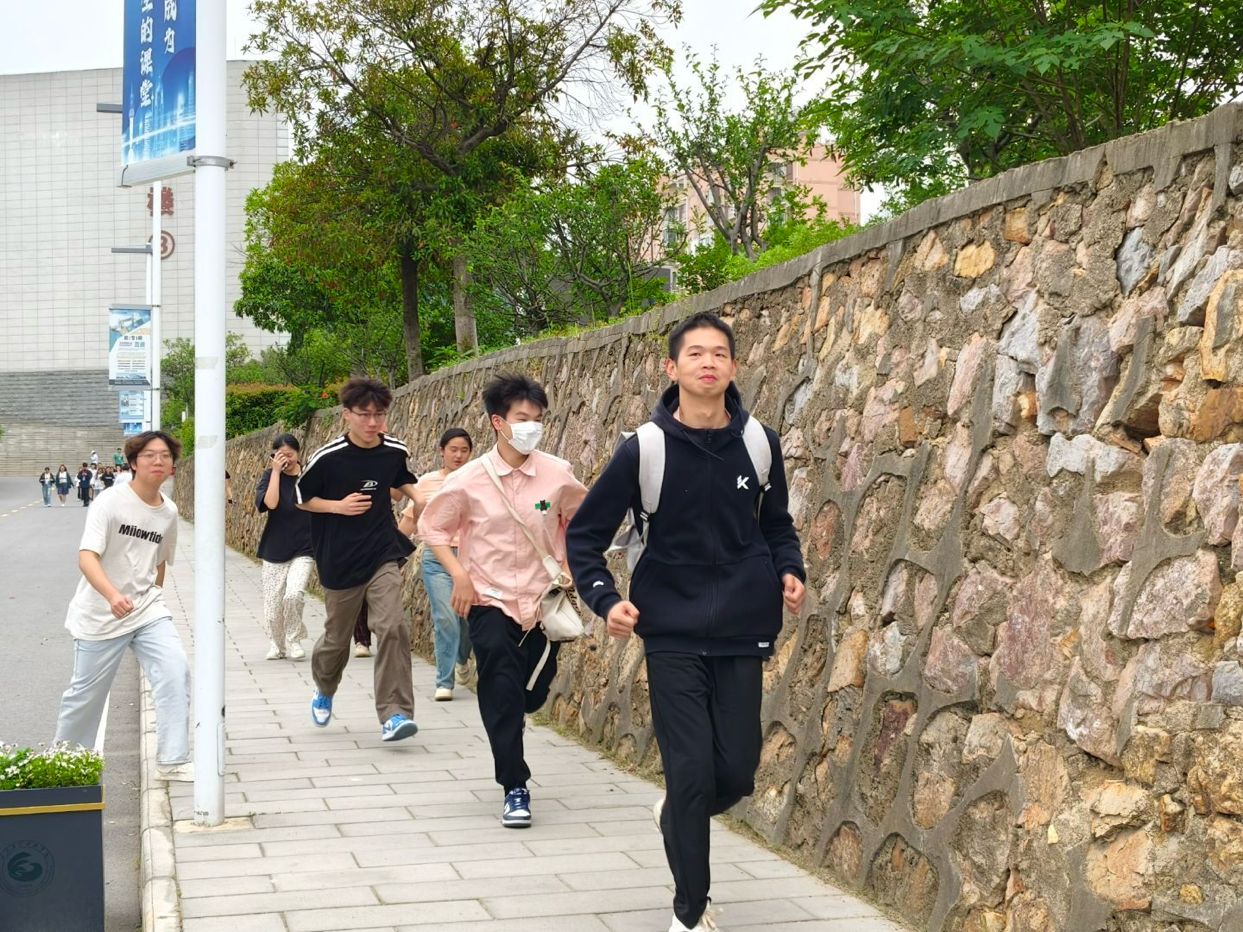 启动仪式结束,领导嘉宾签名打卡合影留念。与此同时,参赛选手们在田径场就位,在经济与管理学院学生干部孙王子辉同学的指导下进行跑前热身,以帮助选手们更好地适应接下来的酷跑,预防身体拉伤。