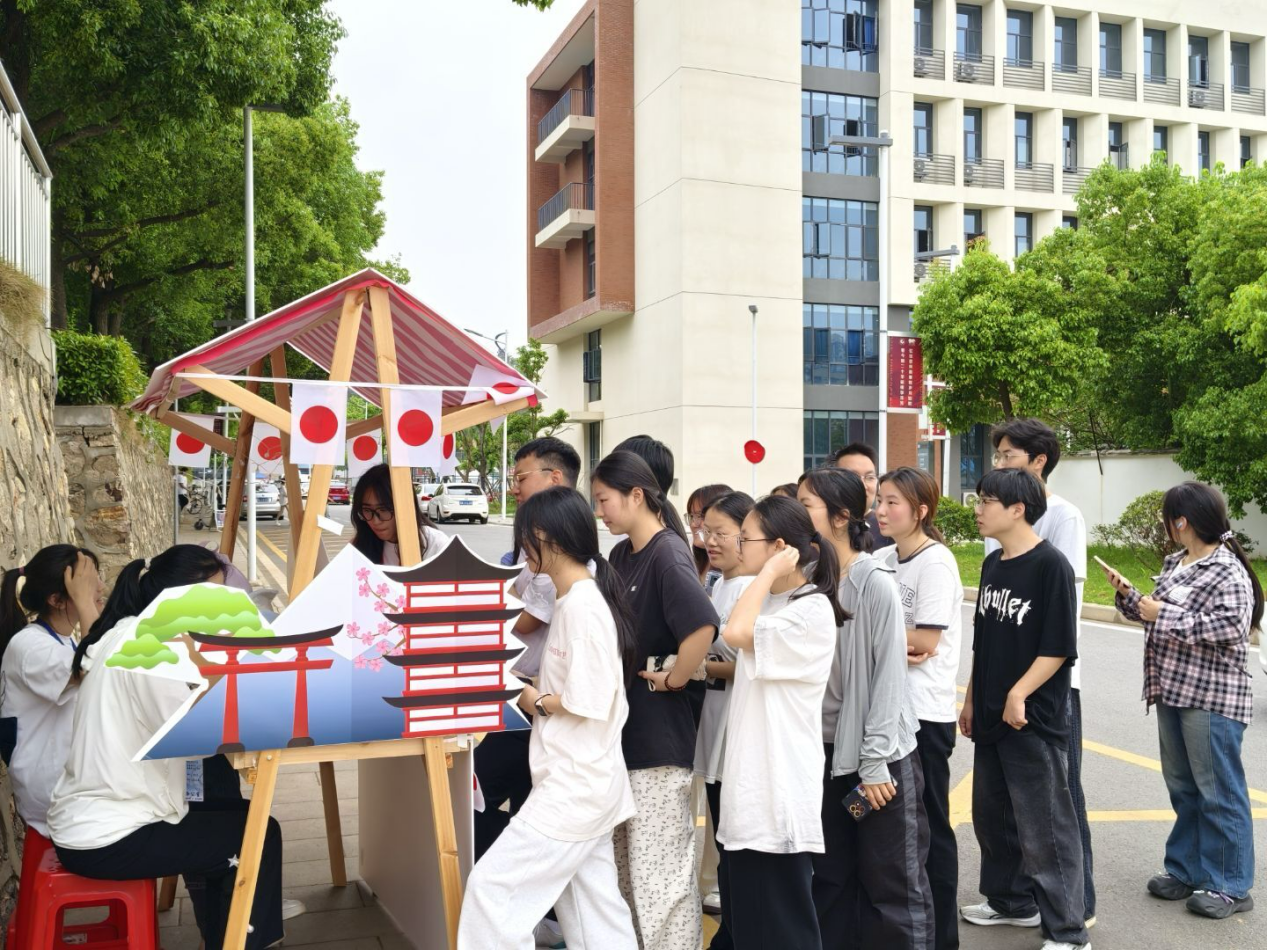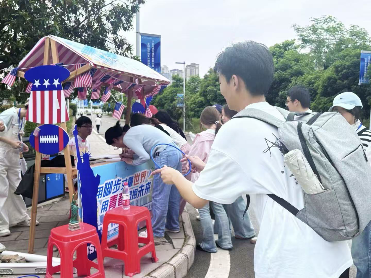 啪,校长助理唐军国按动发令枪发出那振聋发聩的一声响,运动员们争先恐后穿越起跑线,纷纷奔向美国、泰国、日本、英国、澳大利亚五个目标点位,投入到紧张刺激的知识竞答和乐趣无穷的游戏中,有条不紊地进行积分打卡挑战。其中最具特色的是代表美国和泰国的游戏点位,自由女神像作为美国的标志性建筑,象征着自由和民主,“自由女神套圈乐”这一游戏参与者站在1米外,用红、白、蓝三色各色圈环套中“自由女神”的雕像。1分钟内套中2次即可通关;大象在泰国被视为力量与优雅的象征,是泰国人民的骄傲,“大象转圈泼水乐”这一游戏参与者先原地转3圈,模拟大象鼻子,然后用湿海绵投掷到目标桶内,1分钟内投中2次即过关。