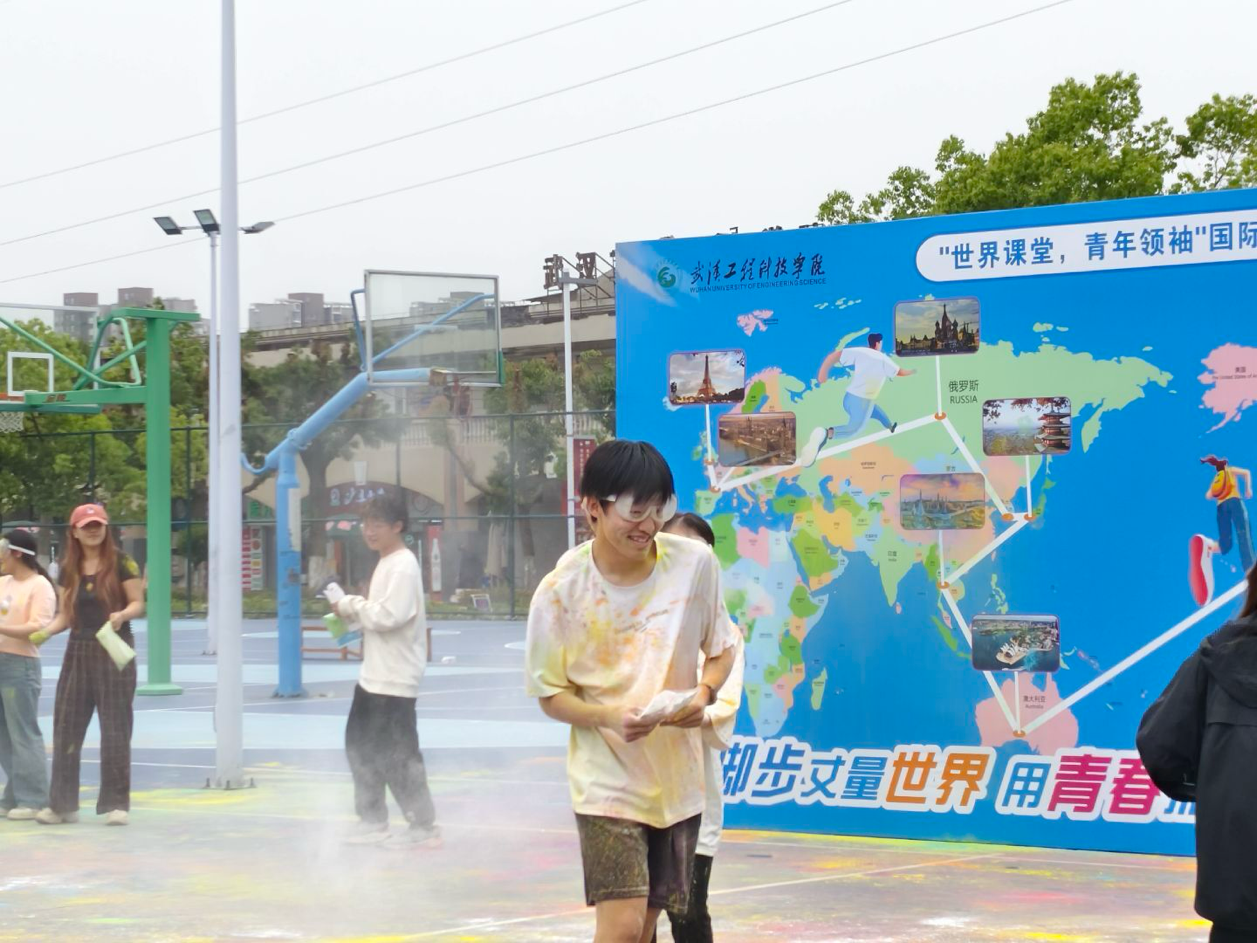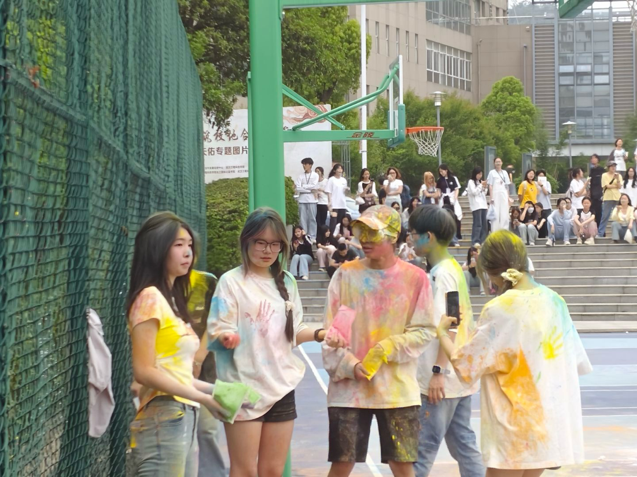 随着各个点位的活动进入尾声,参赛选手们纷纷到达终点西门篮球场。终点处为各个选手准备了彩虹粉。在他们的面前是一张巨大的世界地图,选手们纷纷将彩虹粉投掷到地图上相应的理想留学国家,愿意以开放的心态去学习和体验不同的文化,在地图上留下美好的梦想与希望。同时,同学们也扬起手中的彩虹粉向彼此抛洒,在彩虹粉的“雨幕”中奔跑、欢笑、嬉戏,彼此的脸上、身上都沾满了彩色的粉末,整个场地充满了青春的气息和无尽的欢乐。