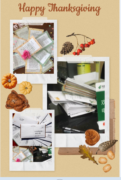 在大家热情度最高的感恩信使活动中,一封封精心准备的信件被投入纸箱,等待着送到他们主人的手上,信封或朴素,或华丽,里面都是一颗红彤彤的心,寥寥几行话语,包含的是由衷的感激和敬爱,同学们和在场的志愿者们每完成一次短暂的交接,不久后就会有一位善意的人脸上露出真心的微笑。本次活动总计收到信件接近五百余封,校外邮寄近百余封,这些信件都在感恩节这一天奔向它的主人。