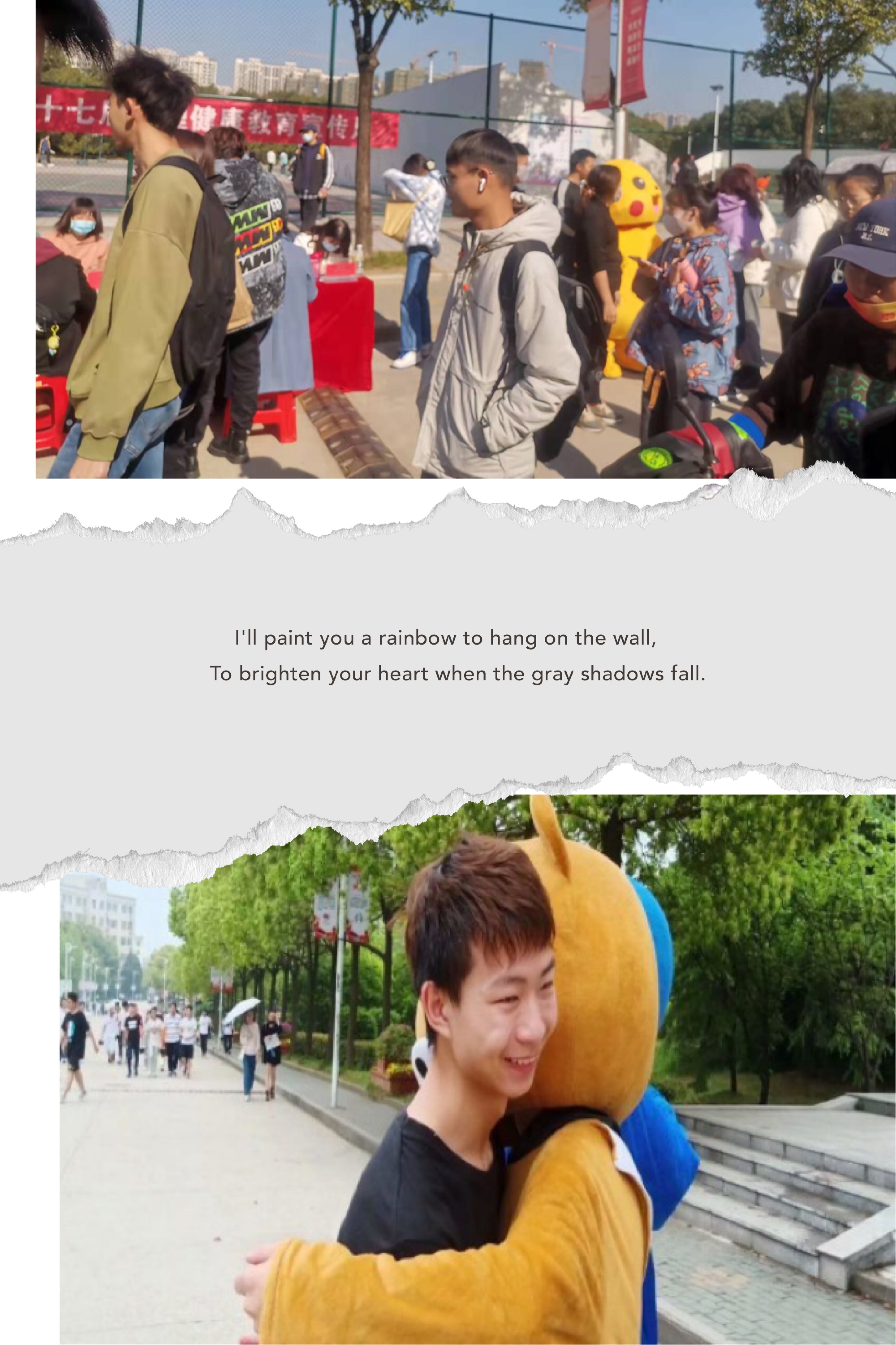 一个柔柔的拥抱带来的是比冬日暖阳更温暖人心的美好,在抱抱团的活动里,大家穿着笨重的棉衣,依然挡不住彼此的善意,隔着那些尼龙,羽绒,棉线,人与人体温的传递,距离的缩短,平添了几分慰藉,也许在这个冬日里依然有很多烦恼没有说出口,但是当我们拥抱的那一刻,都从彼此身上获得了努力向上的勇气。