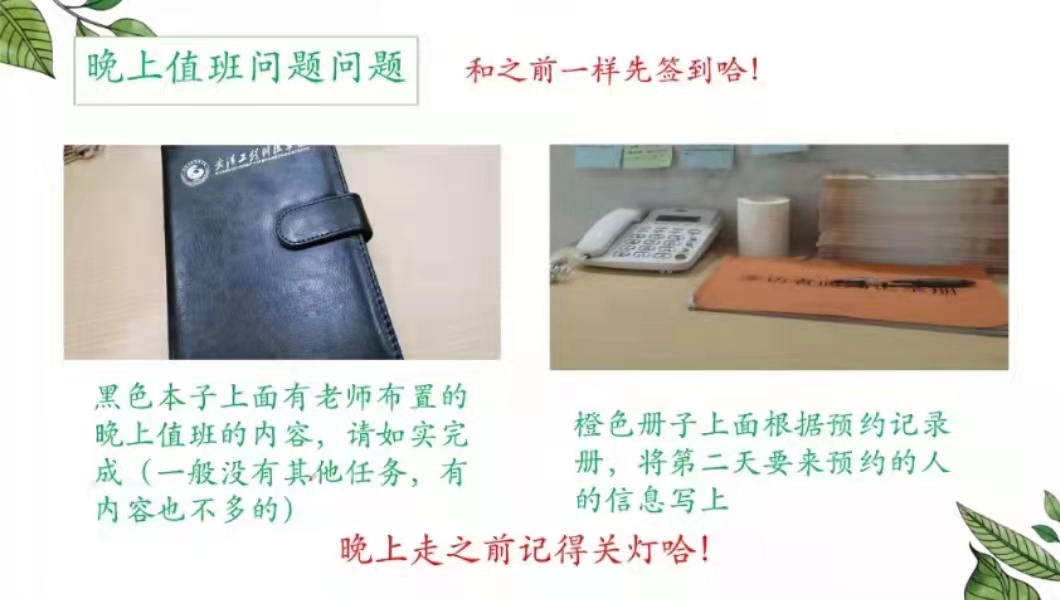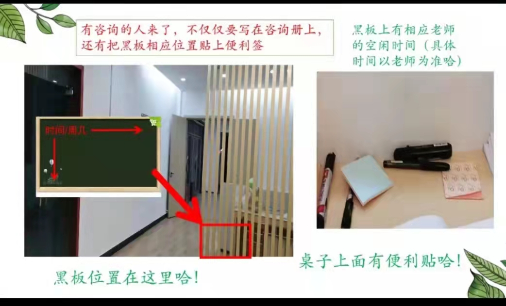 首先,天蓝心协会长刘晓冬同学进行了关于值班流程、具体工作内容以及注意事项的讲解。她讲到心理咨询是大学生心理健康评估的桥梁,而建立桥梁需要有同学来帮助搭建。值班地点位于图书馆四楼,值班人员需要到指定位置进行工作,部员们要在值班群拍照打卡并且填写签到表,引导心理咨询的同学填写咨询记录册,在黑板相应位置上贴上便利贴。晚上值班需要完成老师布置的值班内容,写上第二天需要预约的同学信息,并在最后提醒同学们值班结束之后要注意关灯关门。