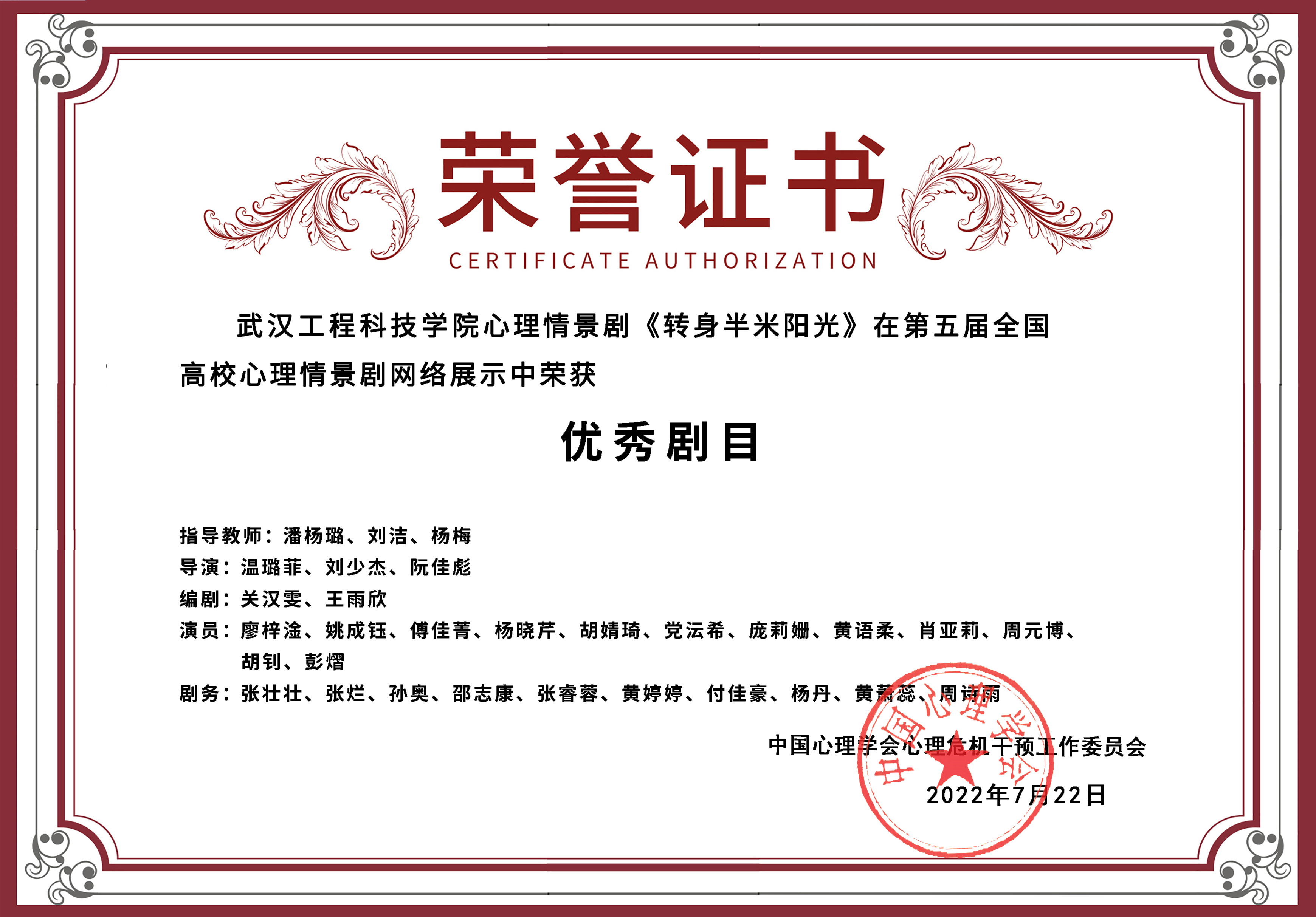 向阳逐梦”为主题,全国280余所高校的287个剧目参赛。经过激烈竞争,我校选送心理剧《转身半米阳光》在第五届全国高校心理情景剧网络展示中荣获“优秀剧目”称号。