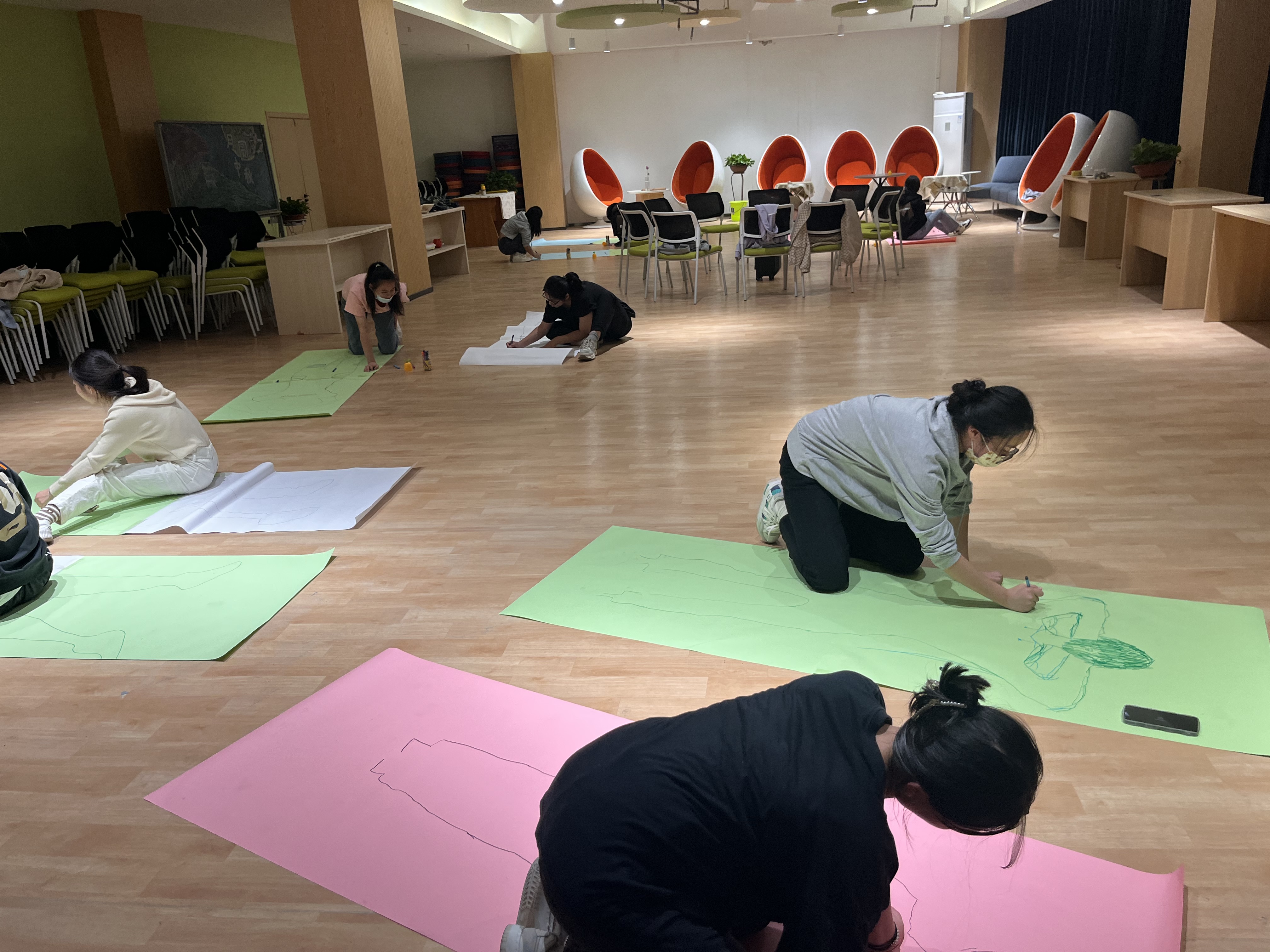 首先,带领者澄清团体性质,邀请成员们逐一自我介绍,初步构建合作温暖的团体氛围。,然后,通过“律动沙锤”活动活跃氛围,让成员们完成团体中同频的律动,进一步强化团体氛围。接着,带领者表述活动规则,引导成员分组完成自己的“描身画”。最后进行作品的分享展示,在成员的互动互相回应中,享受团体。