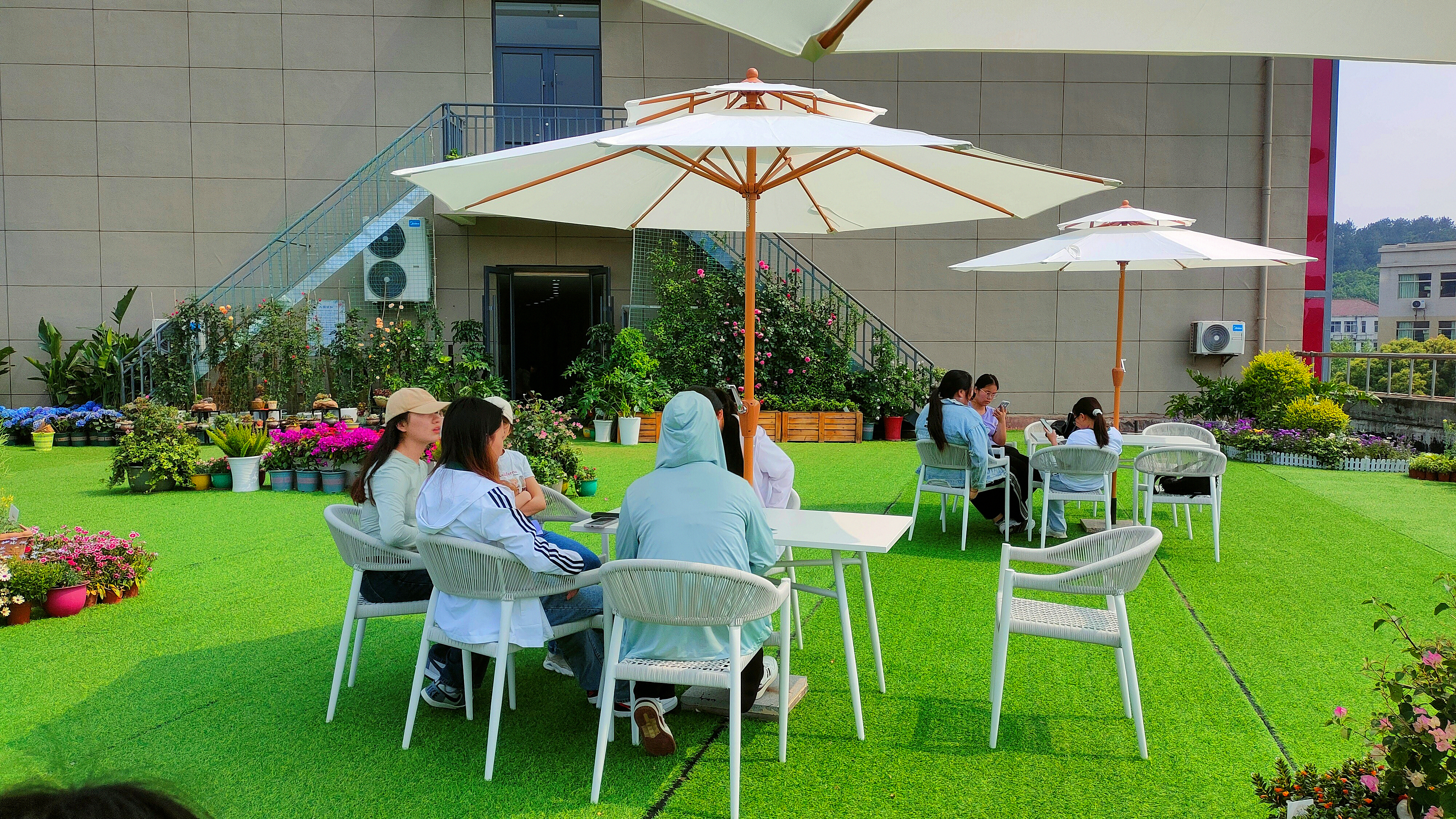 清晨,同学们带着入场券兴致勃勃地走进了“五感花园”,在参观期间,细细欣赏着每一株植物,轻嗅着它们的芬芳,自觉维护花园的环境。正午,即使烈日炎炎也丝毫不影响同学们观花赏景的积极性,三五成群坐在遮阳伞下分享生活的愉悦,许多结伴而来的同学们寻觅一处称心合影留恋。优美的环境下,每一位同学的脸上都洋溢着笑容。