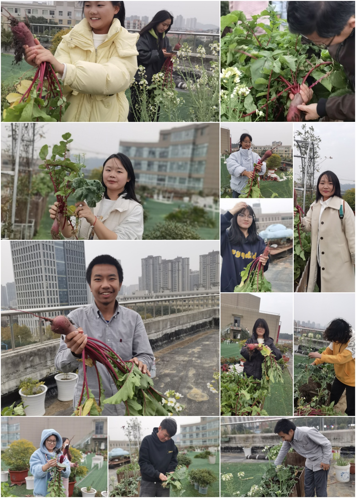 活动伊始,成员们逐一尝试亲手采摘芥蓝和萝卜。鸡腿芥蓝挺拔的身姿和红萝卜埋在土里胖胖的根茎,那是一种不一样的开心和喜悦,亲手收获自己种下的芥蓝和萝卜,采摘活动结束后小组成员进行全体合照,手上成熟的芥蓝依旧挡不住成员喜悦的笑脸。