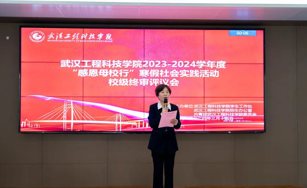 答辩结束后,张美华老师对答辩选手进行总体点评。她分别从ppt排版布局、着装、汇报内容、台风几方面进行点评,并对答辩技巧作了仔细的讲解。首先,她向所有参与本次实践活动的选手们表示感谢,作为武工院学子,他们返回家乡作为“名片”不仅宣传了武汉工程科技学院,还是连接大学和母校的桥梁,将感恩之心带回了母校,起到承上启下的作用,并鼓励武工院学子们积极参与到寒假社会实践服务中,不断提升自我、完善自我。