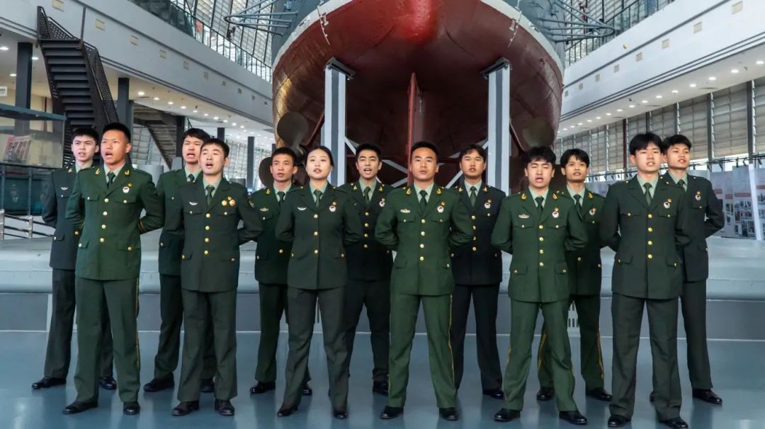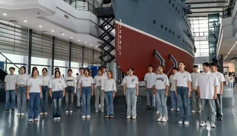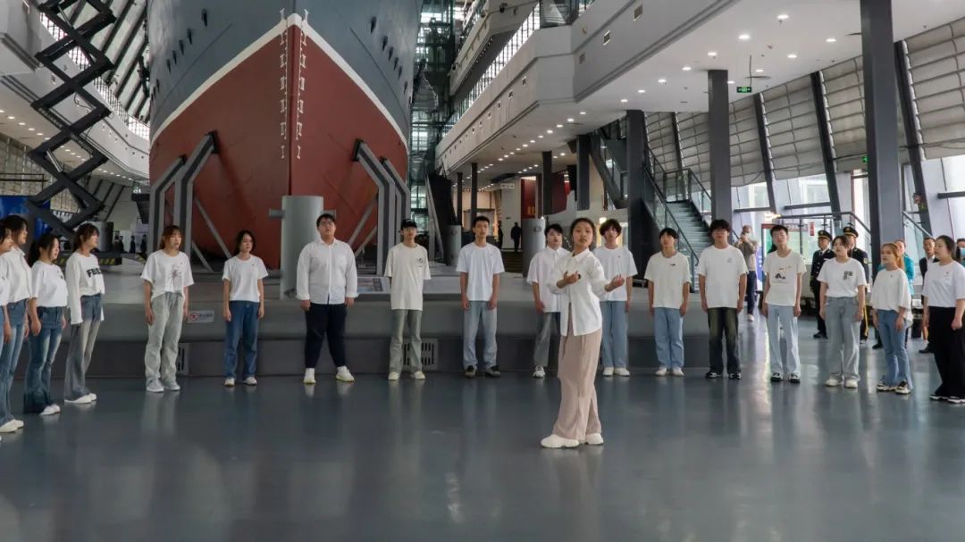 馆内,历经沧桑的中山舰静静地诉说着历史的沧桑,仿佛在倾听学生们激昂的歌声。当《保卫黄河》《强军战歌》《如愿》的旋律响起,学生们纷纷围站在中山舰四周,最后汇聚到了舰首。他们的歌声嘹亮、气势恢宏,充满了力量和热血。