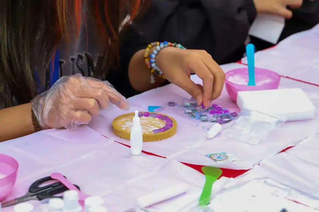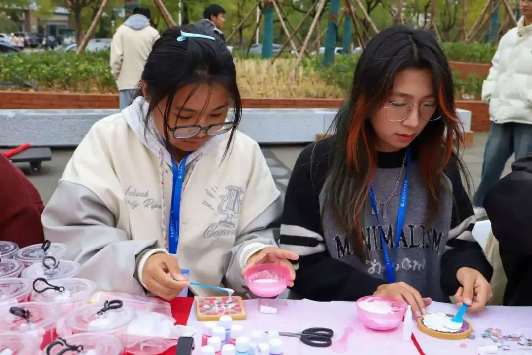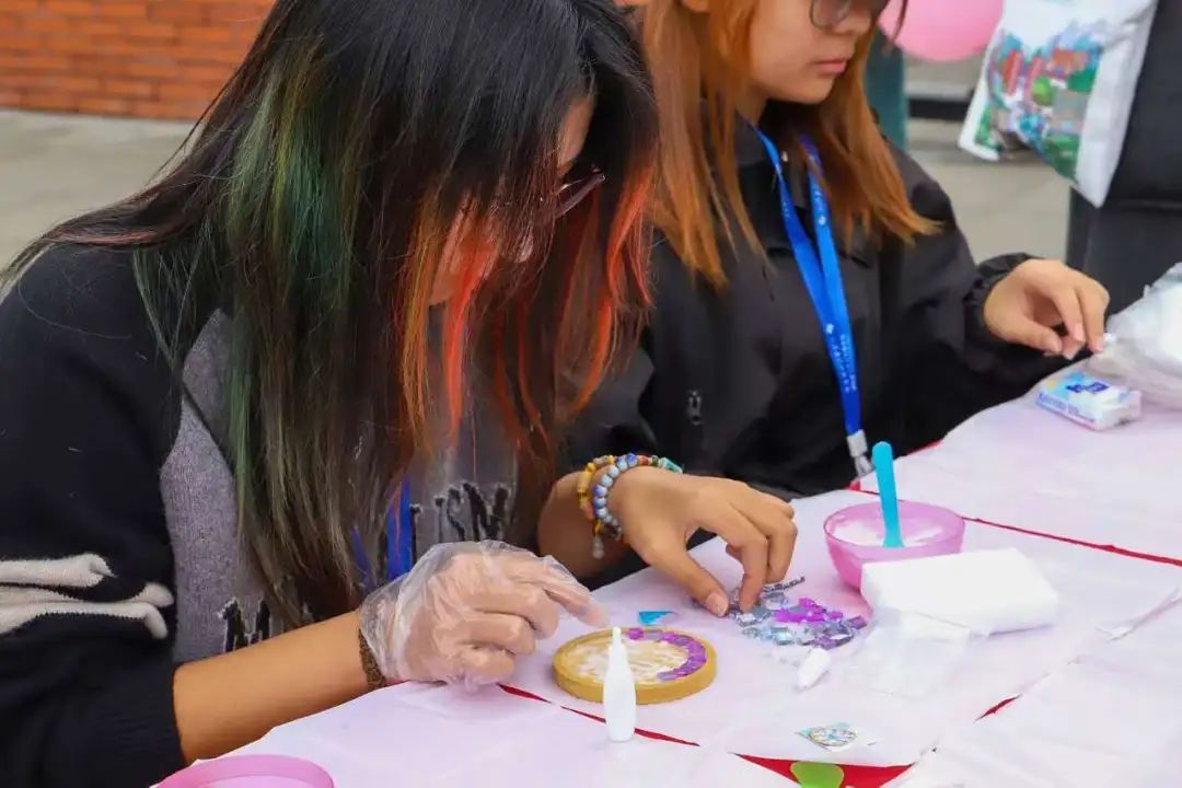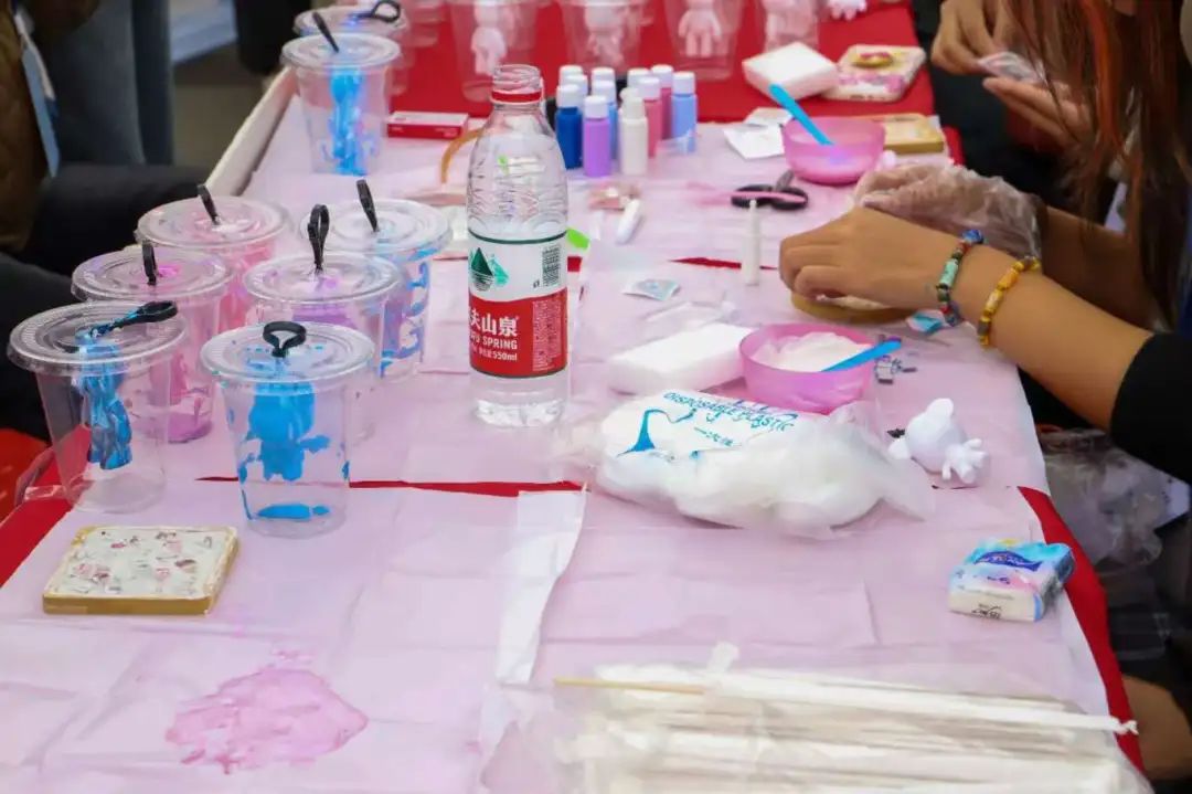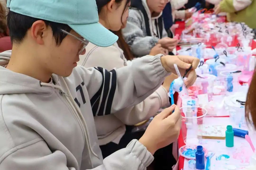艺术与传媒学院设置了“流体熊DIY”“杯垫DIY”两个互动小游戏,为同学们提供手工活动的同时,也带来一场心灵的聚会。同学们将自己喜欢的颜料依次倒入杯中,形成独特的色彩纹理,制作出专属隔热杯垫。
