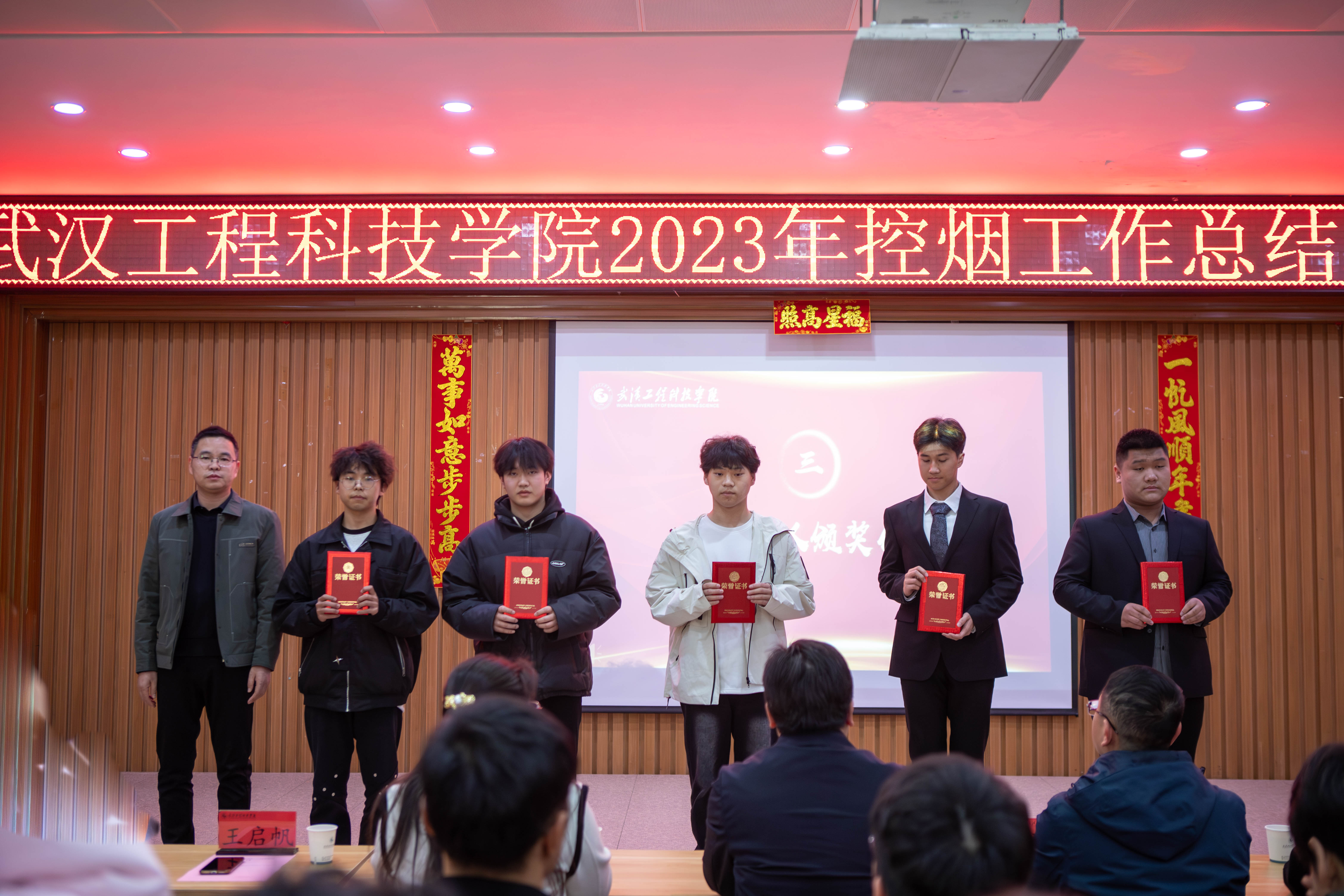 为总结2023年度控烟工作成果,推进2024年控烟工作,争创无烟校园,3月8日下午,武汉工程科技学院在学生事务中心311报告厅举办2023年度校园控烟工作总结表彰大会,学校党委副书记、校长助理唐军国,后勤保卫处处长易荣伟,学生工作处副处长李迎,学生工作处副处长、校团委书记张瑾,各学院党总支书记及师生代表参加了活动。本次大会由学生工作处资助中心主任杜雪晴主持。