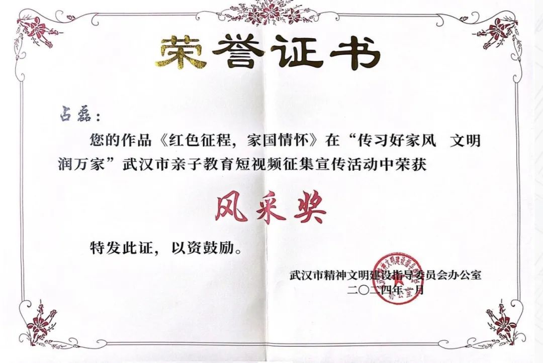 近日,“传习好家风 文明润万家”武汉市亲子教育短视频征集宣传活动颁奖典礼在汉举行,我校艺术与传媒学院广播电视系2022级广播电视编导专业学生占磊的作品《红色征程,家国情怀》荣获“风采奖”。