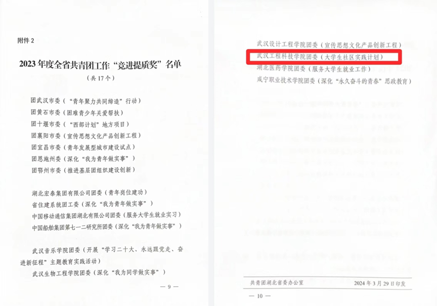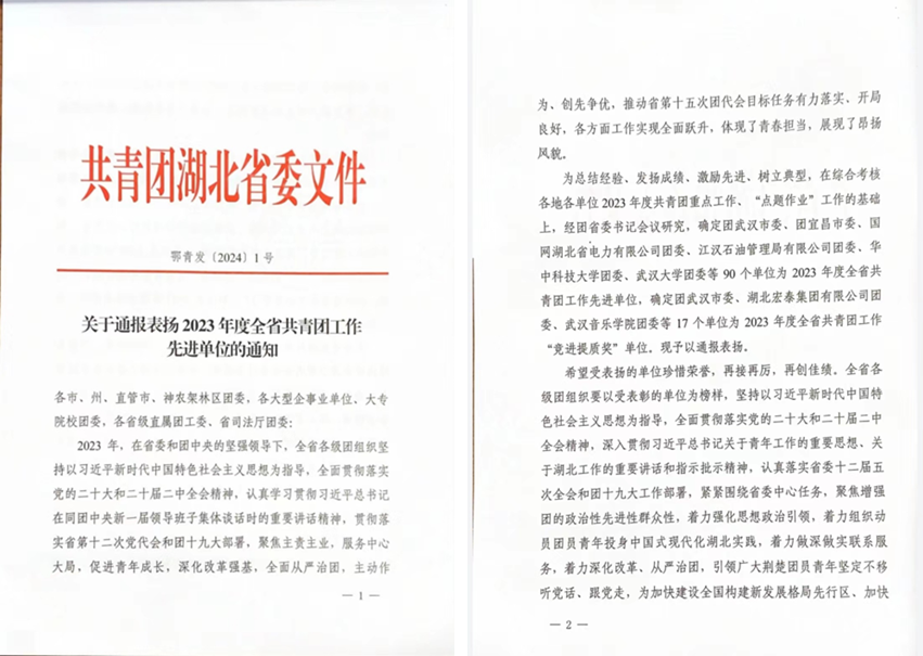 近日,共青团湖北省委公布《关于通报表扬2023年度全省共青团工作先进单位的通知》,我校团委入选2023年度全省共青团工作“竞进提质奖”名单。