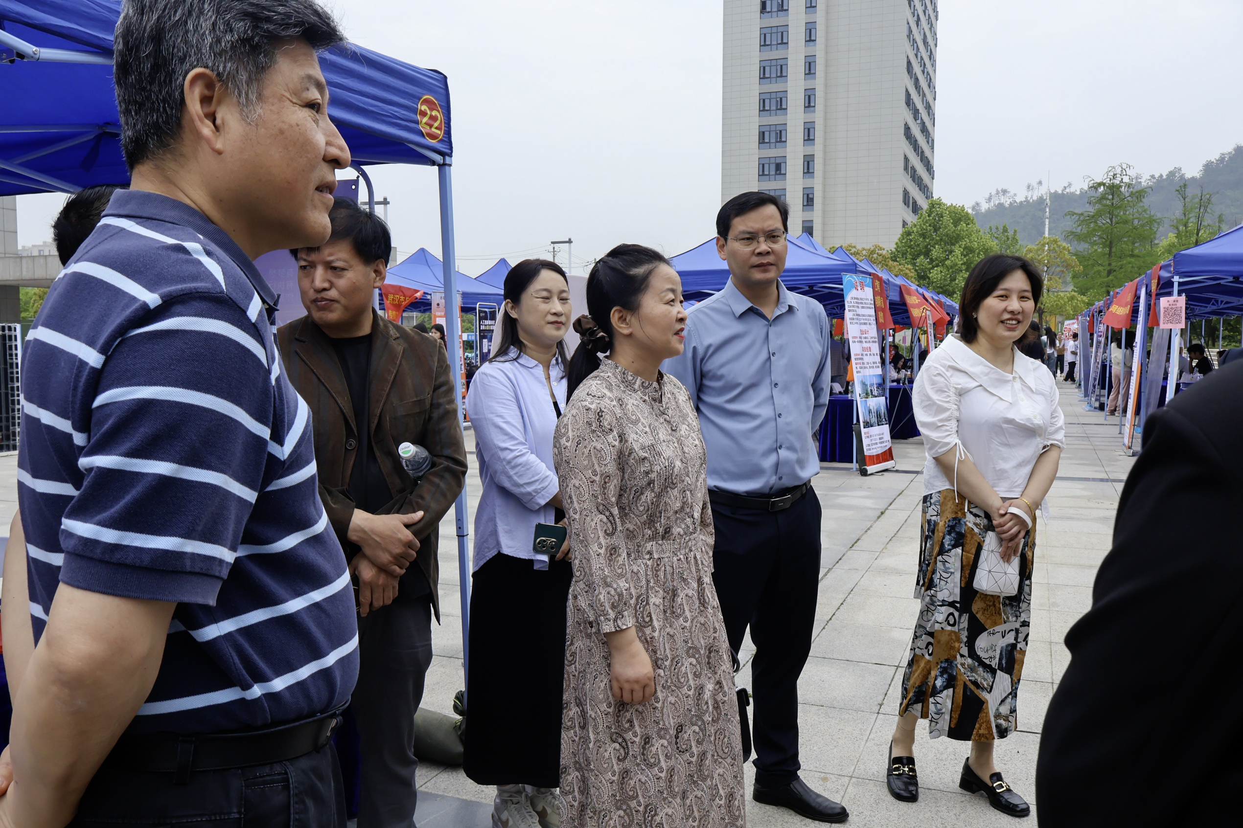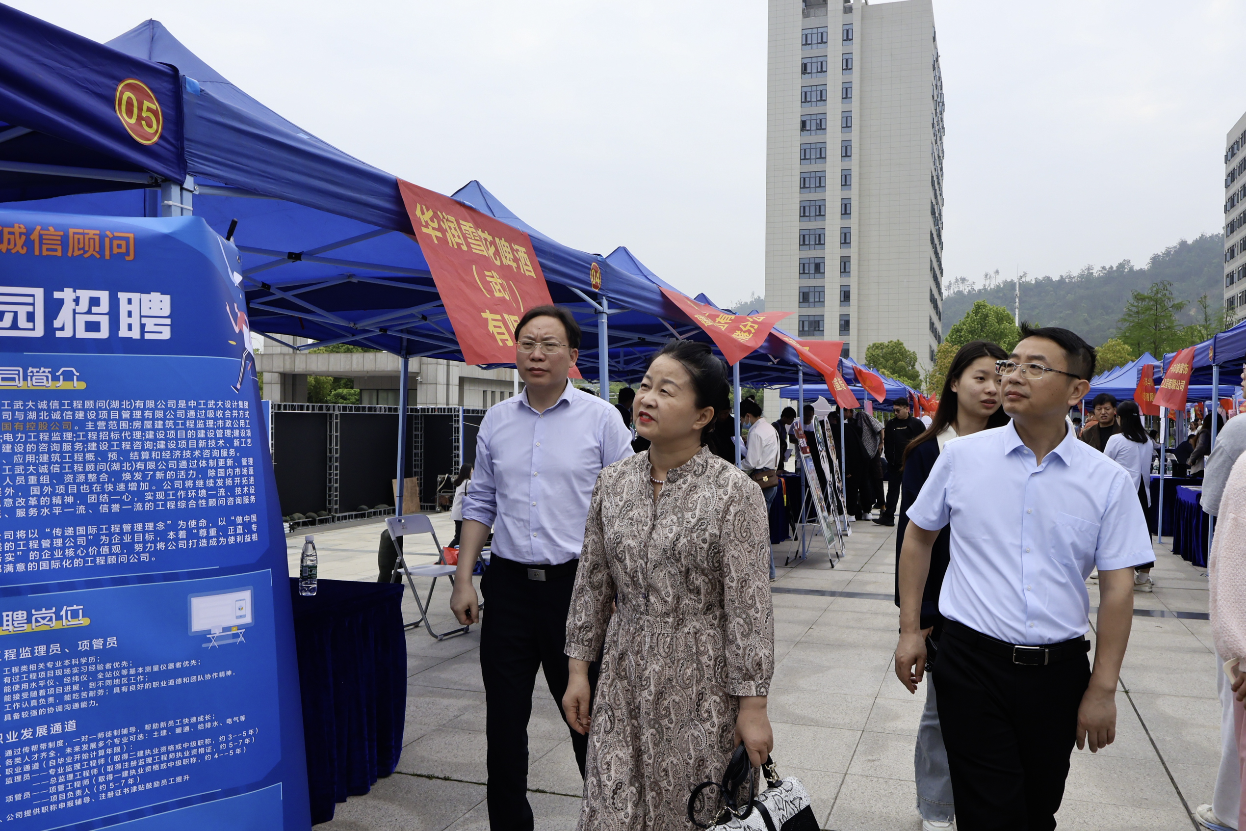 招聘会现场,校领导走访招聘展台,与用人单位和毕业生交流互动,倾听用人单位对学校人才培养建议,详细了解各单位招聘情况和毕业生就业情况。