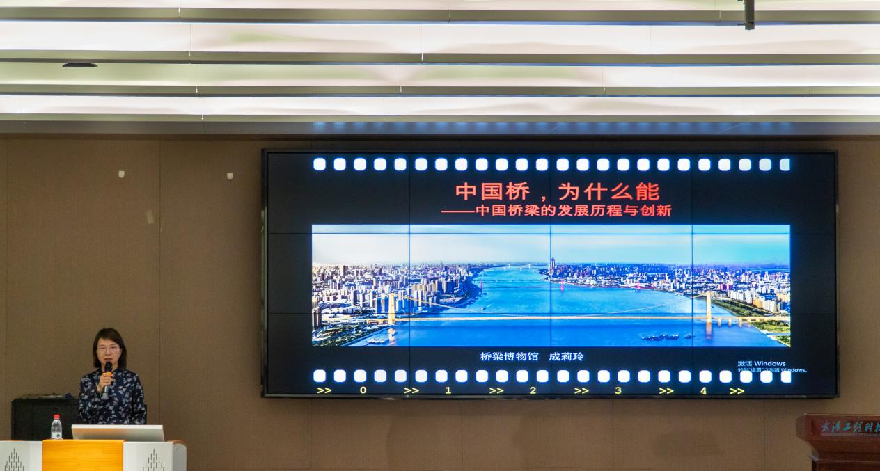 成莉玲馆长从“中国桥梁发展历程”、“武汉长江上的桥梁”、“桥梁发展展望”、“桥梁精神”这四个方面为大家描绘了中国桥梁的发展画卷。她以“长江大桥”为例,讲述了67年前,中国建桥者用跨越天堑、超越自我的决心和勇气,完成了“一桥飞架南北,天堑变通途”的壮举,武汉长江大桥成为中华人民共和国成立后修建的第一座公铁两用的长江大桥。正如成莉玲馆长所说的那样:“跨越天堑,超越自我。”在场师生都受益匪浅。