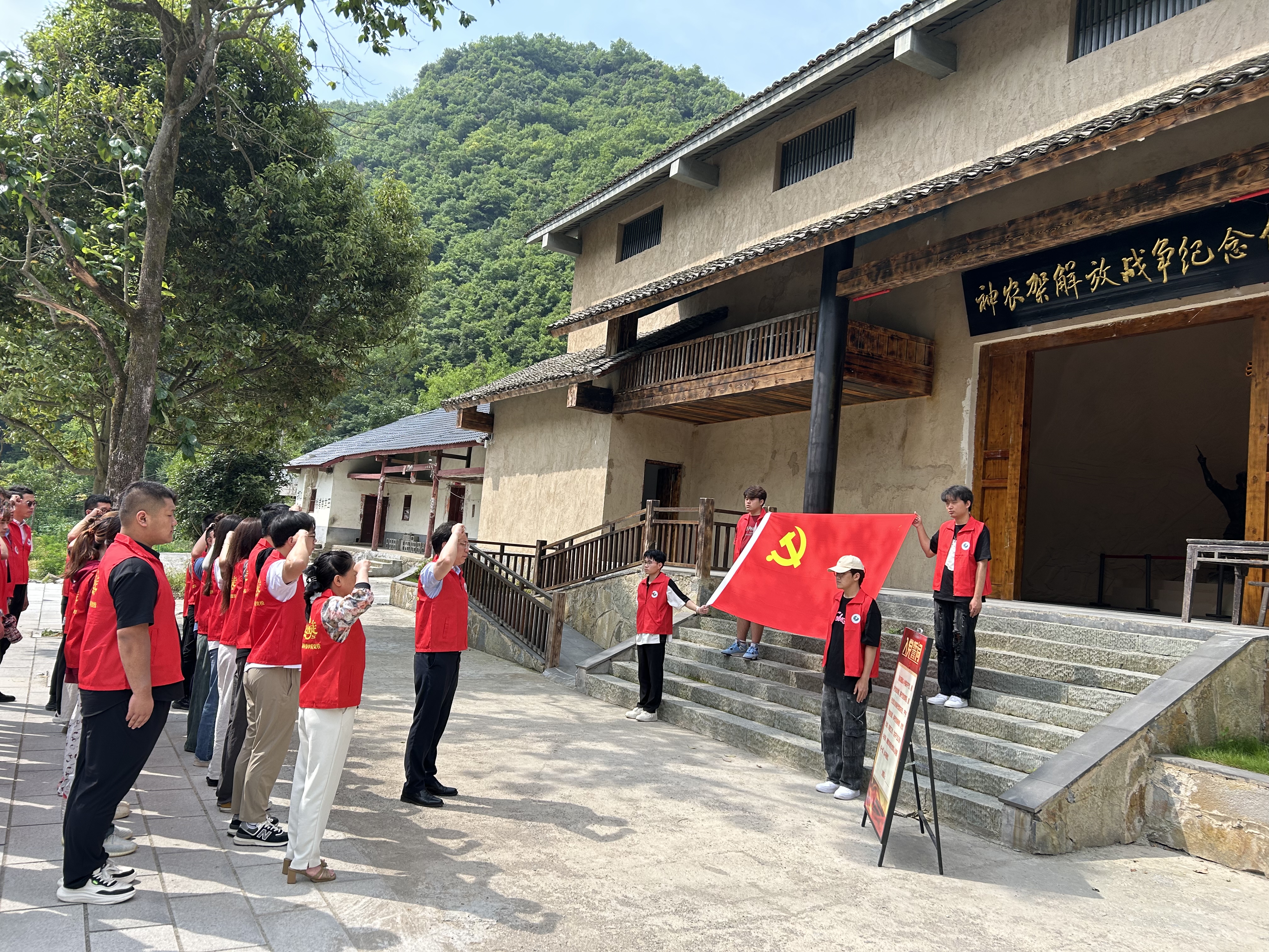 25日上午,团队一行来到林区松柏镇古水村,通过参观林区苏维埃革命纪念馆和神农架解放战争纪念馆、观看红色革命教育短片,了解1931年贺龙率领红三军创建鄂西北革命根据地、房县古水区苏维埃政府,以及革命英雄肖大恒在古水开展轰轰烈烈、可歌可泣的红色革命活动的伟大事迹,同学们直观地感受了战争年代神农架共产党员和人民武装用拼搏奋斗乃至牺牲生命的壮举换来累累战绩的艰辛与伟大,进一步体悟了“中国共产党为什么行?”的历史之问。“最后一碗米送去做军粮,最后一尺布送去做军装,最后一件老棉袄盖在担架上,最后一个亲骨肉送去上战场!”纪念馆上方悬挂的这首民谣歌词,以及墙壁上记载的一篇篇英雄史诗,让所有参观者的心情亦是久久无法平静。参观结束后,团队中的师生党员们举行了庄严的重温入党誓词仪式,同行的入党积极分子也对入党誓词进行了诵读。