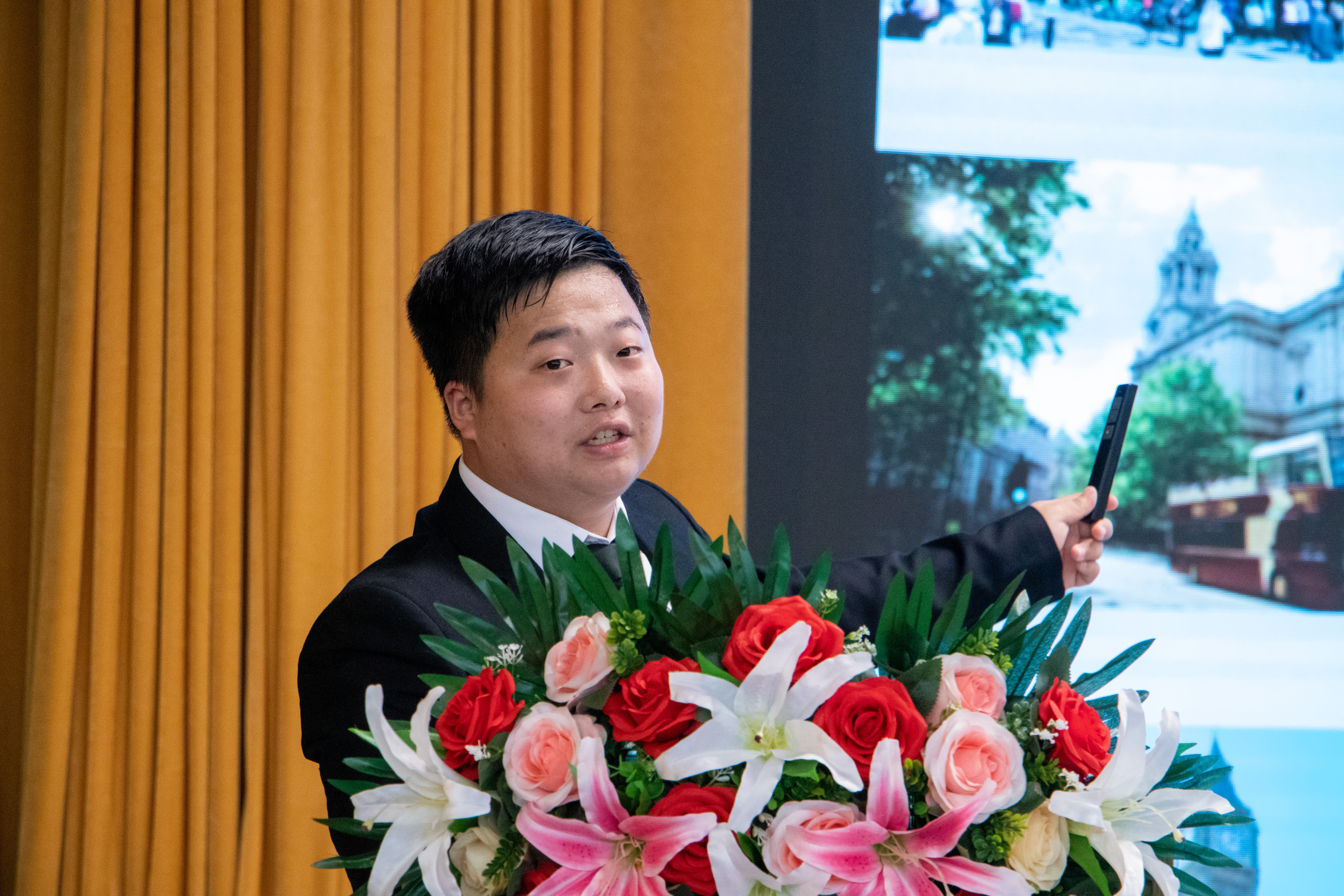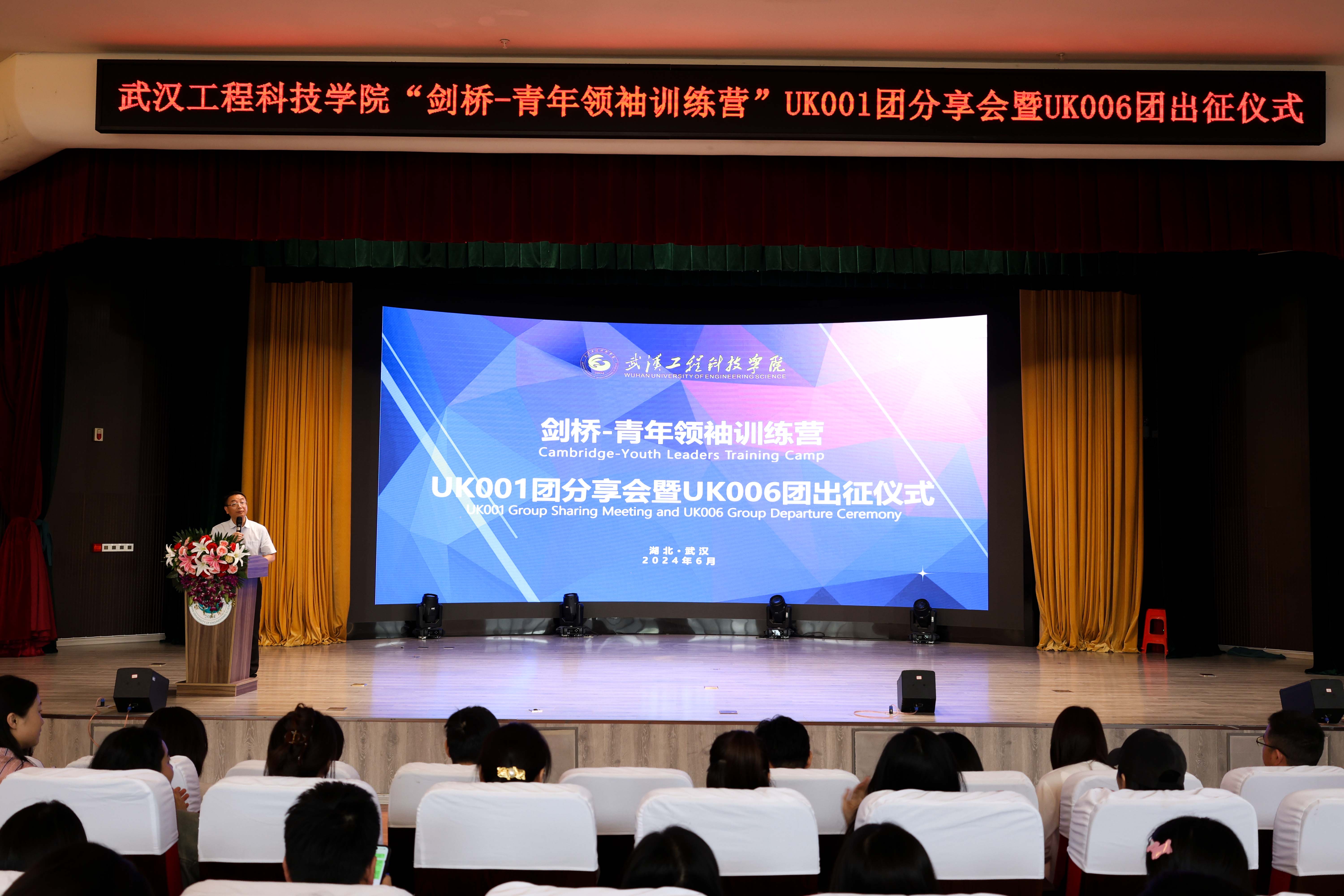 王加青致辞。他首先对顺利完成微留学项目归国的段秦辉同学表示祝贺,同时也期待即将出行的UK006团的7名同学能在英国学习之旅中去体验海外名校课程、感受多元学术氛围、了解不同生活文化。他表示,剑桥—青年领袖营项目既是落实学校“高端化 全球化 个性化”发展战略的需要,也是拓宽学生们的国际视野、提升学生们的语言能力和跨文化交流能力的重要途径。他对即将启程的同学们提出几点期望和要求:第一,安全出行,确保顺利完成学习任务。出行前,要认真了解目的地的政治经济、法律法规、风土人情等相关情况,避免因文化差异而引发不必要的冲突。出行中要注意人身安全、财务安全等,尊重当地风俗习惯,遵守团队纪律,遇到困难和问题时及时向老师求助;第二,加强学习,不断提高自身综合素质。要明确自己期望、带着目标去学习,积极参与海外学习过程中的各项课程、活动中去,勇于表达自己的观点和想法,保持对新奇事务的好奇心,锻炼自己迎接挑战和适应环境的能力,及时总结反思,将所学所得转化为推动个人未来发展的强大动力;第三,深入交流,互学互鉴推动共同进步。在海外学习过程中要加强同团内其他高校的同学之间的团队协作,共同传播中华优秀传统文化,促进中外文化交流互鉴;第四,树立形象,展现中国青年优良风貌。要塑造良好的个人形象和精神风貌,在学习活动中展现自己的专业能力和素养,做到认真负责、勤奋努力。最后,他希望,大家能够珍惜这次海外学习的机会,以更加开放、包容、自信的姿态去迎接挑战和机遇。