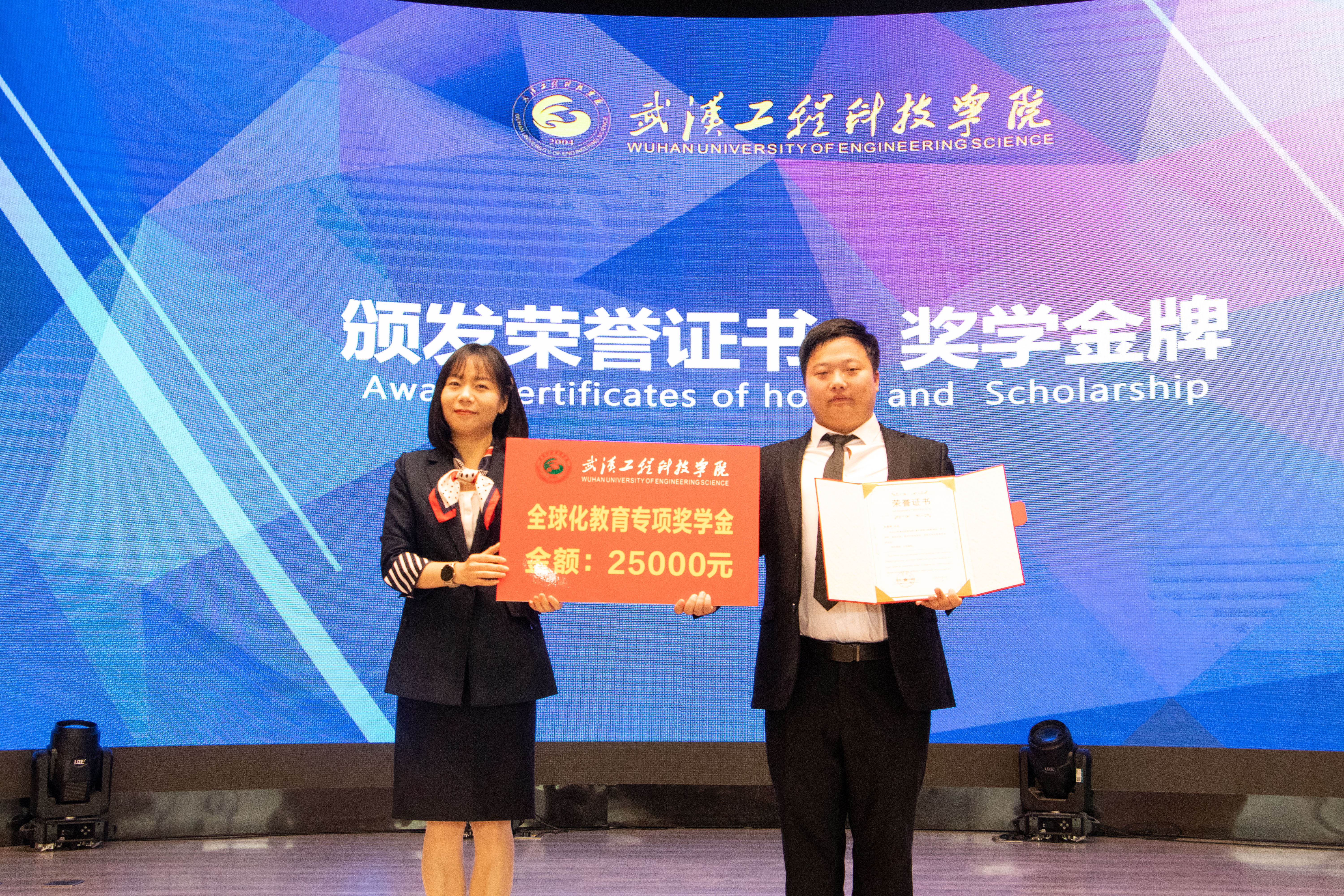 赵欢为段秦辉颁发荣誉证书、奖学金牌。