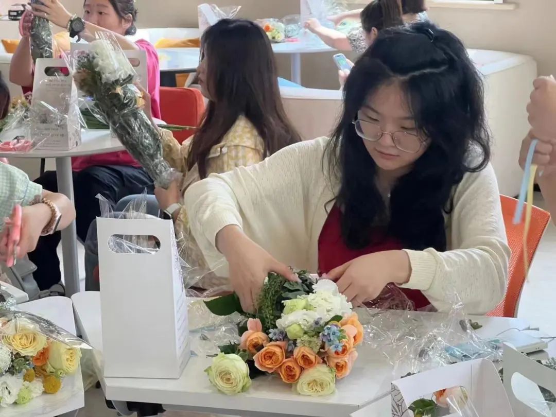 “让我们共同体验这项欧洲贵妇们最喜欢的活动,把自己当成最优雅的‘欧洲贵妇’将手中的花变成独一无二的艺术品……”实践环节开始,现场氛围便被推向了高潮,讲师耐心细致的从花的品种、色彩的搭配、造型的设计等方面进行了讲授。同学们按讲师所教授的方法进行独立创作,他们以花为材,修剪花枝,整理花朵,经过择器、取材、配花、修枝、插作等步骤后,一件件精美的插花作品陆续完成。同学们的作品各具特色,一束束鲜花不仅凝结了同学们亲手创作的喜悦,也蕴含着同学们对美的不同理解。