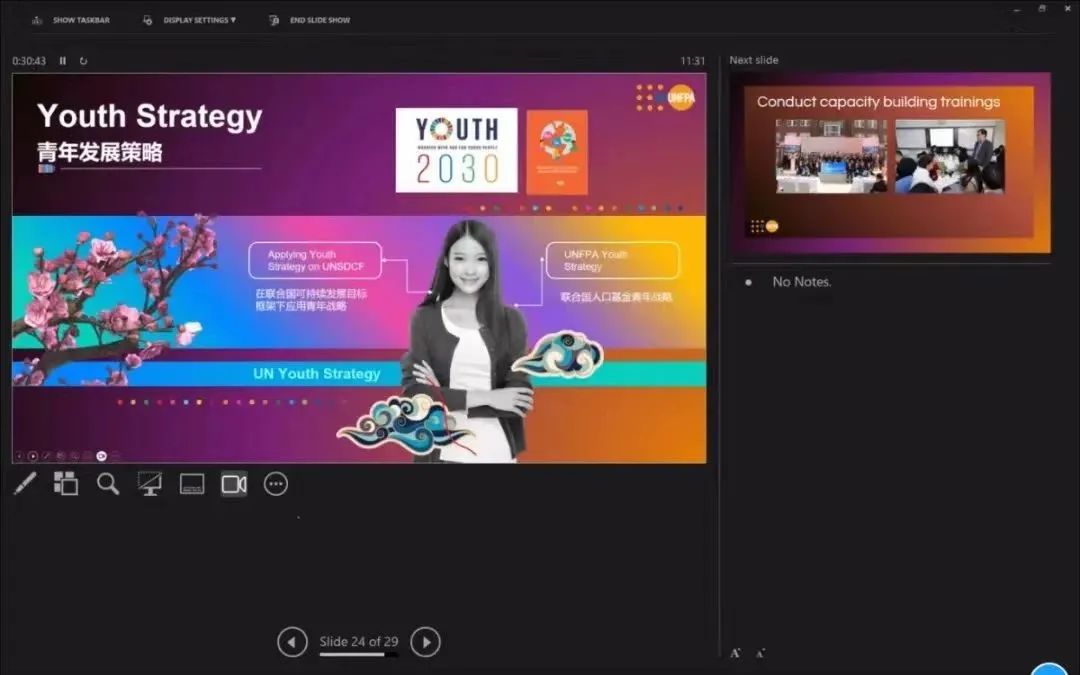 UNFPA第一课,由联合国人口基金驻华副代表欧雯姗为全体校园大使带来主题为《UN, UNFPA and Youth Engagement》的讲授,进一步引导青年学生深入了解联合国人口基金UPower计划,结合联合国人口基金的伟大愿景,提示青年群体要发扬创新精神,关注国际热点话题,积极参与到全球治理的实践之中。