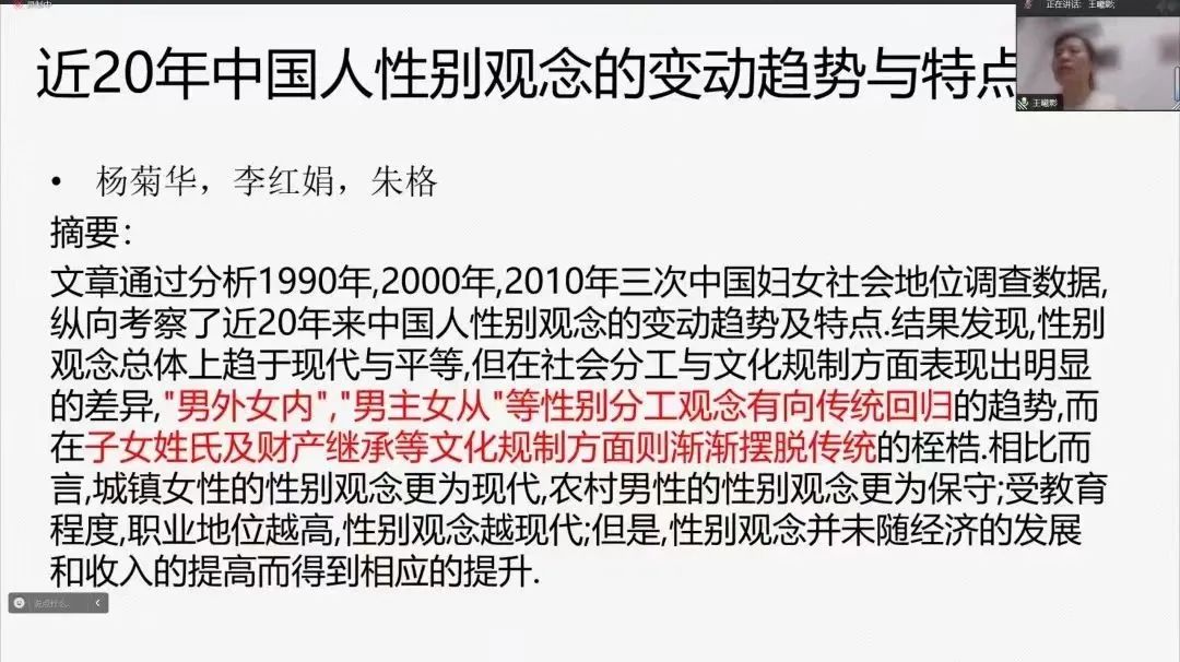王曦影教授主要介绍了中国性别平等的现状,生物性别与社会性别的区别,并从个人特征、文化习俗和国家制度三个方面阐述了人们对社会性别的理解。呼吁同学们学会用性别视角分析教育和社会问题,思考每个人如何从自己的角度出发促进性别平等。