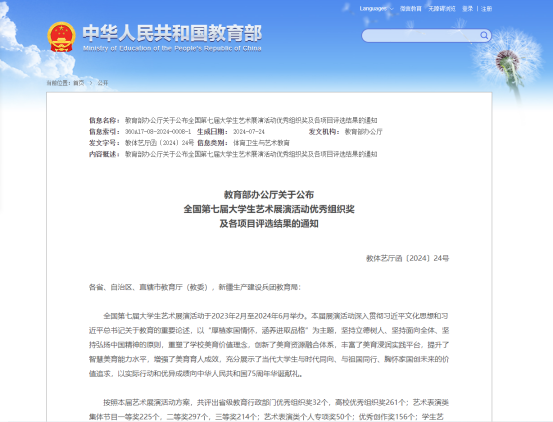 据悉,教育部大学生艺术展演活动每三年举办一届,已成为全国大学生艺术展演活动的重要平台,此次获奖充分展示了我校美育教育和校园文化建设成果,坚持以美育人、以文化人,把社会主义核心价值观培育融入学校美育全过程,扎实推进校园文化建设。下一步,学校将持续加强和改进学校美育工作,全面实施美育浸润计划,积极搭建美育教学实践平台,助力学校美育教育和校园文化建设。