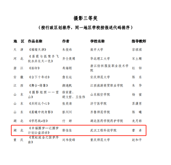 近日,教育部办公厅公布了全国第七届大学生艺术展演活动优秀组织奖及各项目评选结果的通知(教体艺厅函〔2024〕24号),武汉工程科技学院作品《幸福圆梦——记圆梦计划公益活动》荣获全国第七届大学生艺术展演活动艺术作品摄影类三等奖。