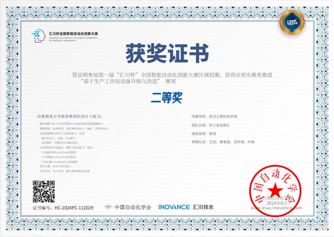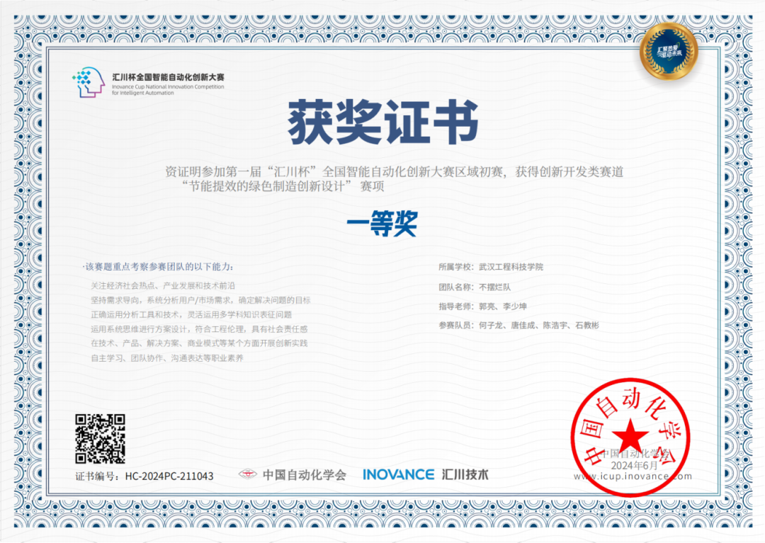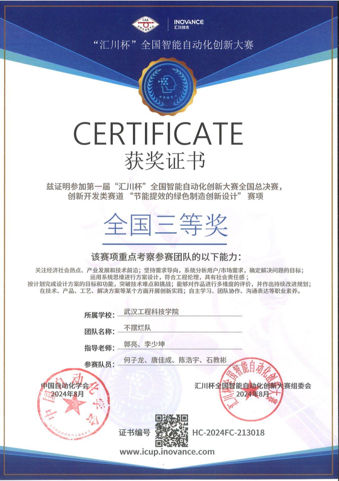 近日,从汇川杯全国智能自动化创新大赛全国总决赛上传来喜讯,武工院学子荣获全国三等奖。