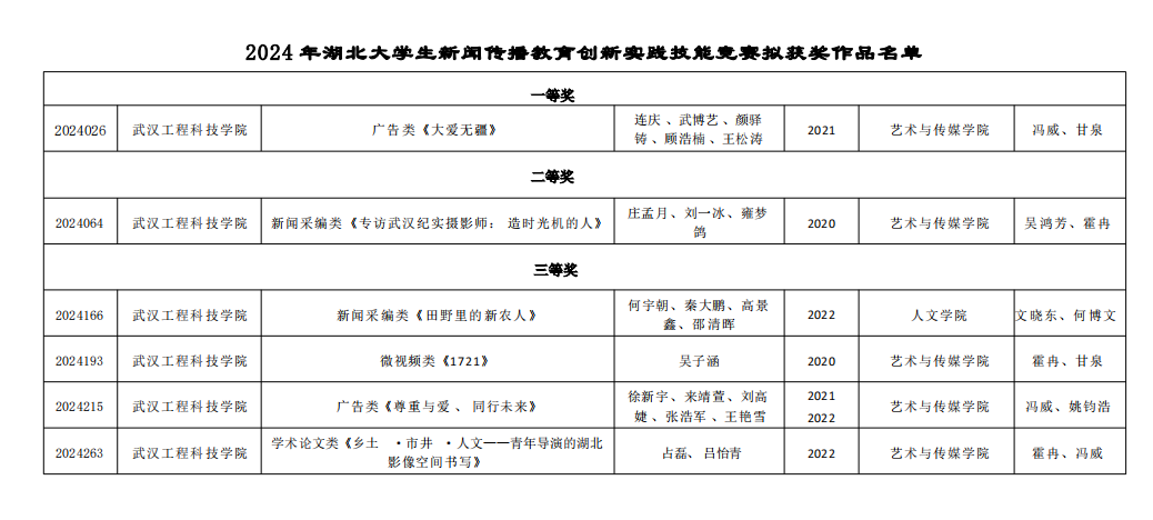 近日,2024年湖北大学生新闻传播教育创新实践技能竞赛获奖作品正式公示,武工院学子斩获一等奖1项、二等奖1项以及三等奖4项。