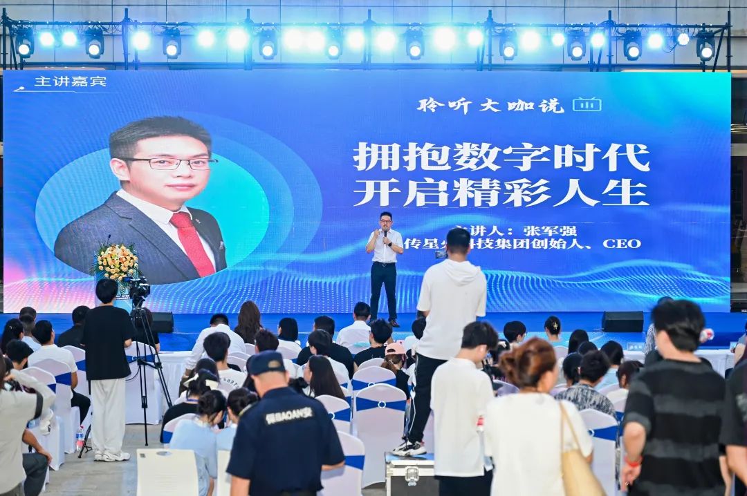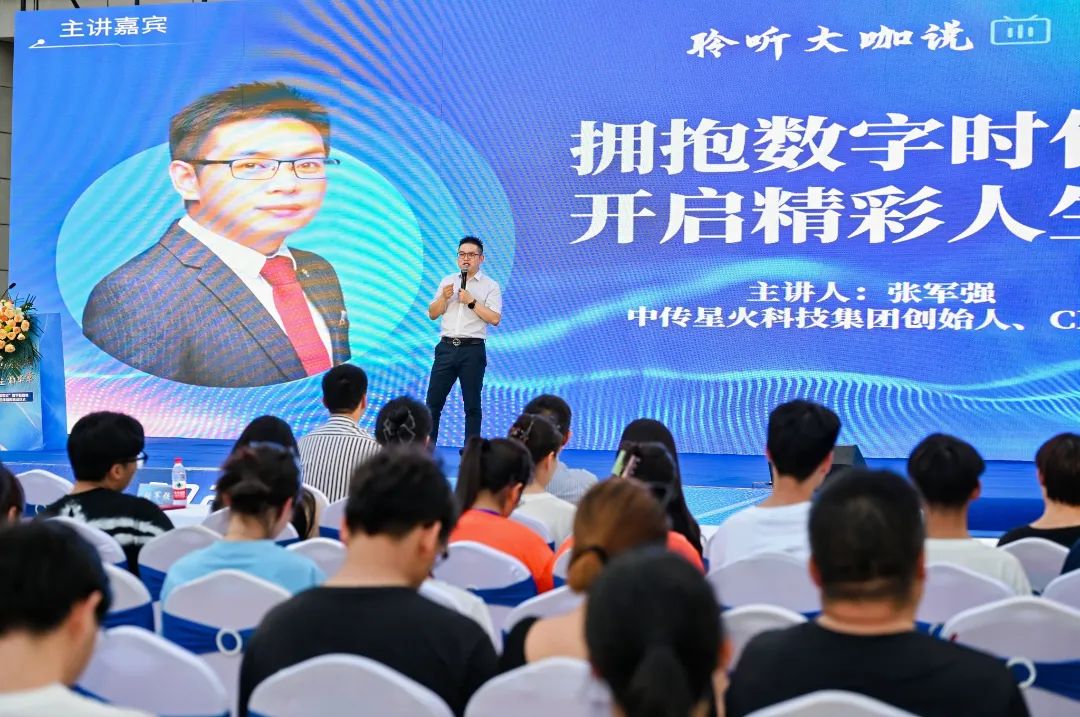 张军强作题为《拥抱数字时代 开启精彩人生》的主题分享。他分享了自己的成长经历,鼓励同学们拥抱数字时代。针对新媒体行业的发展趋势,他表示,未来五年新媒体会成为最重要的商业营销渠道,商业底层逻辑和格局正在加速重构,而在超级个体时代,IP和私域成为最重要的资产。他强调,在新媒体时代,大家要积极从“社会人”向“数字人”转变,学会借助新媒体平台,实现专业和个体价值的放大,加快积累个人IP资产,塑造数字时代个人品牌。最后,他介绍了智慧星火计划和如何加入智慧星火计划,并建议大家从现在开始,积极构建个人专属品牌IP。
