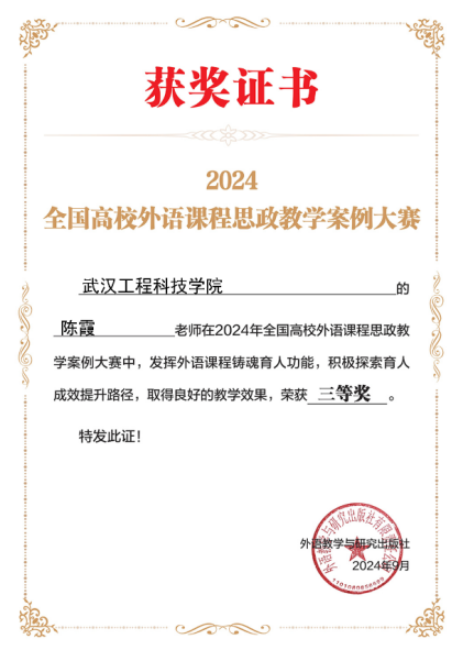 近日,2024年全国高校外语课程思政教学案例大赛最终结果揭晓。本次大赛共有1900余名教师参赛,经过激烈角逐,我校人文学院公共外语教学部3位参赛教师喜获佳绩,王芳老师荣获全国一等奖,陈露老师荣获全国二等奖,陈霞老师荣获全国三等奖。