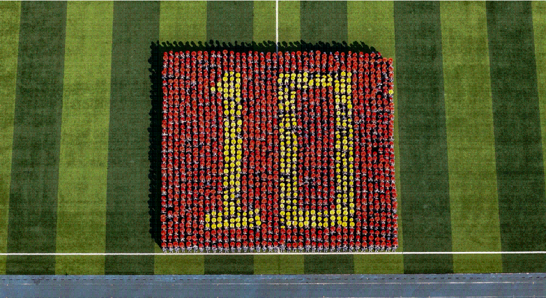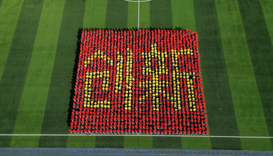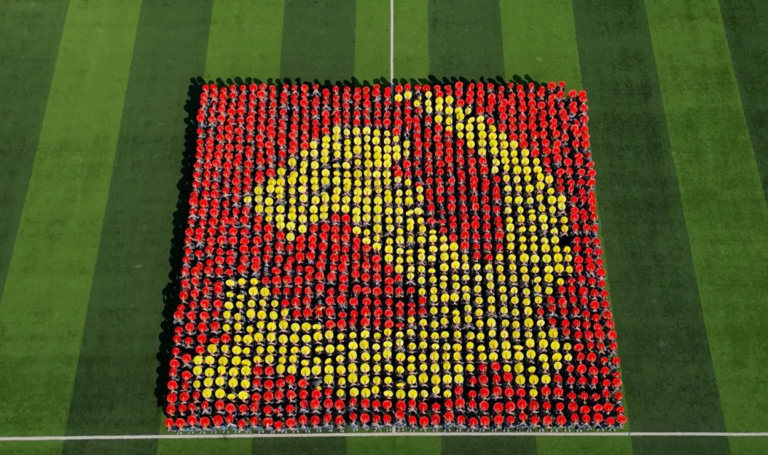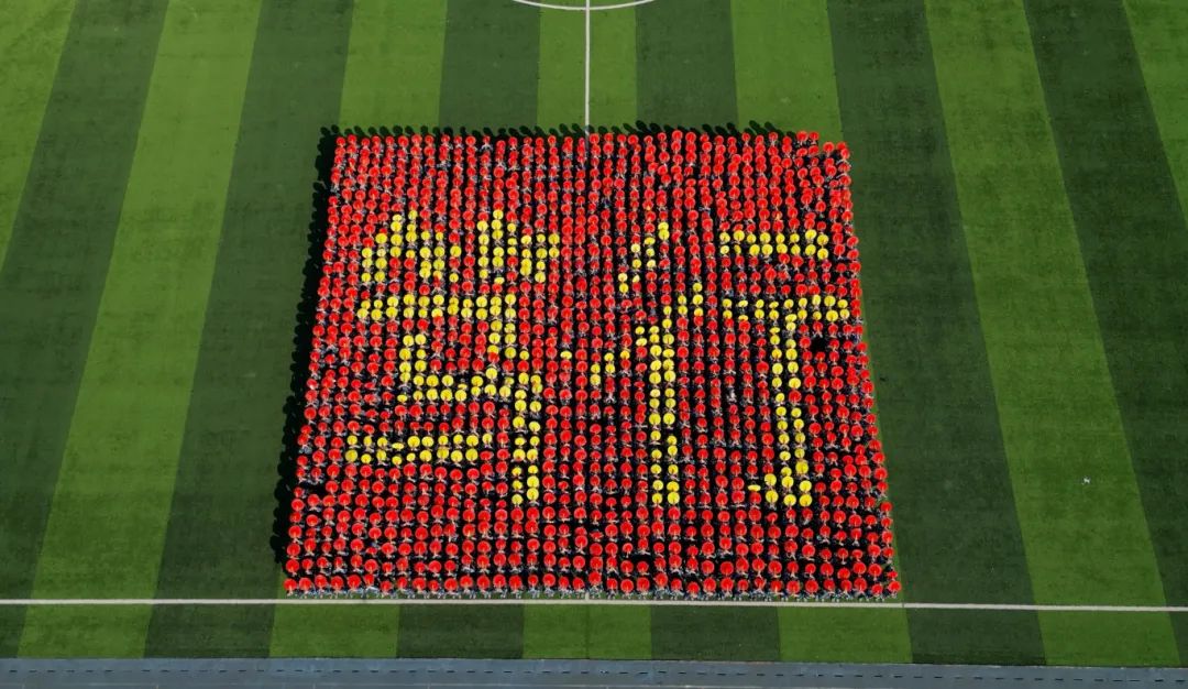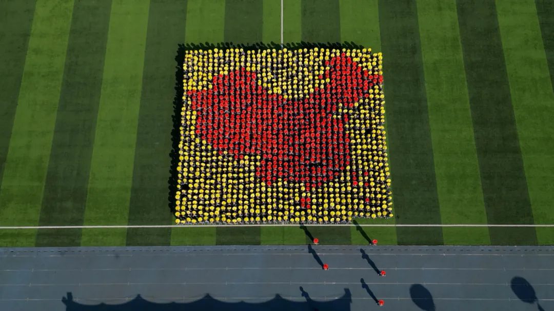 军训成果汇报演出正式开始。伴随着鼓点首先出场的是由1300余名身着迷彩服的女生组成的花样方阵。她们跟随着音乐和旁白,变换手中的红、黄、蓝三色扇形花束,展示出75、党徽、校徽、校训等图案和字样,为中华人民共和国成立75周年和我校建校20周年献礼。
