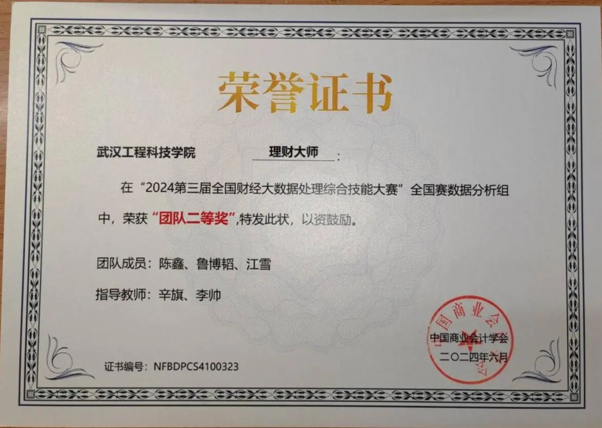 近日,由中国商业会计学会主办,武汉工商学院与深圳希施玛数据科技有限公司共同承办的2024年第三届全国财经大数据处理综合技能大赛落下帷幕,武工院学子获团体二等奖1项。