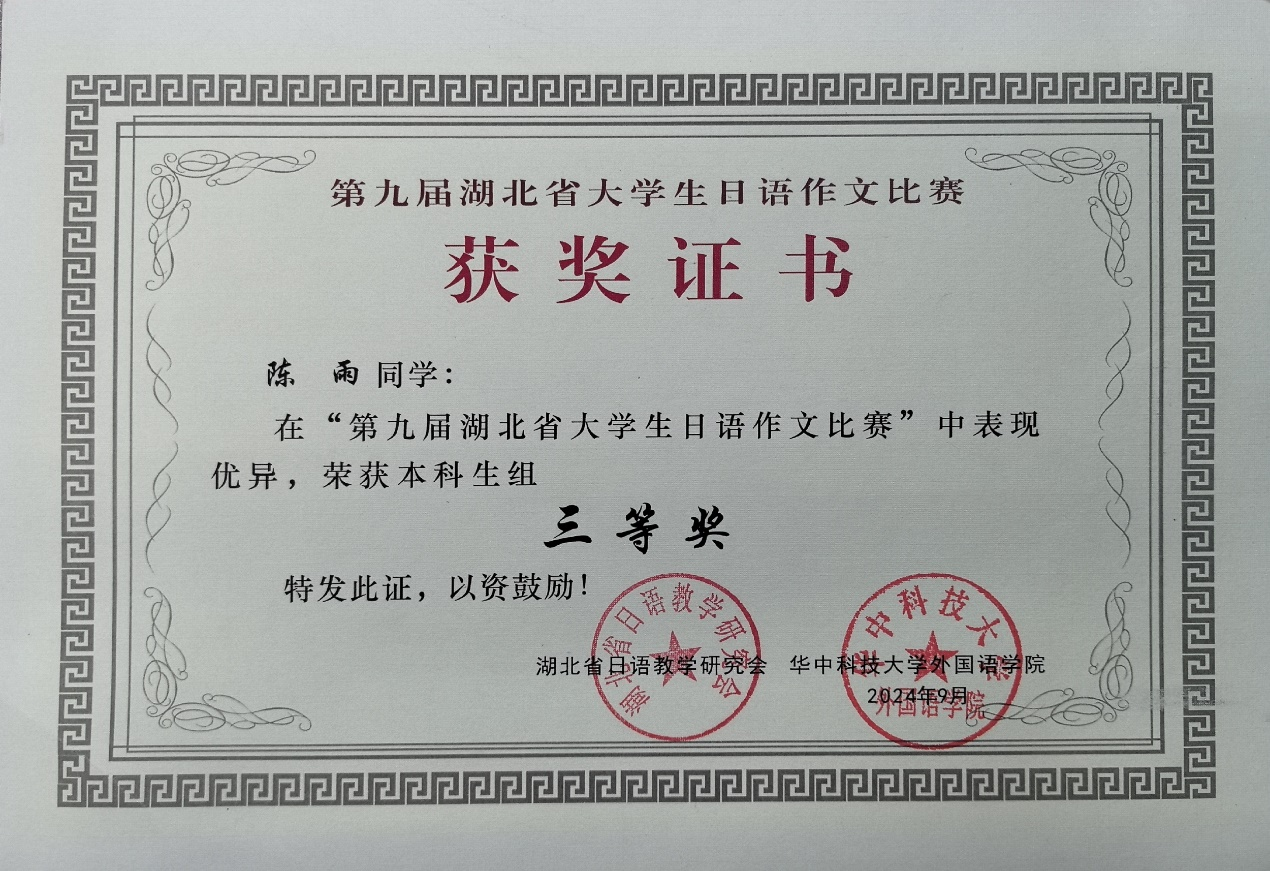 近日,2024年湖北省第九届大学生日语作文比赛圆满落幕。我校陈雨同学在比赛中表现出色,荣获三等奖。